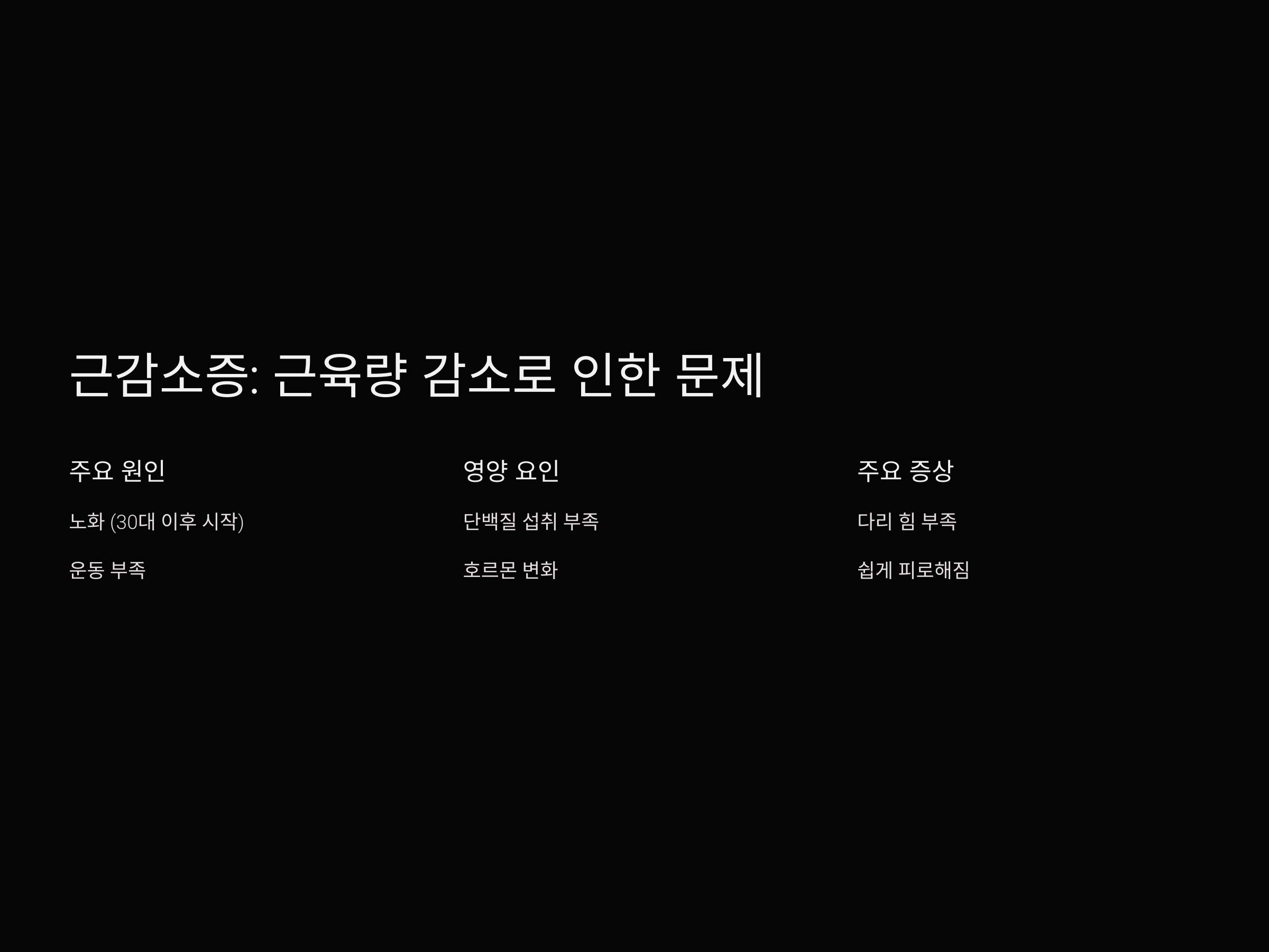 - 나이 증가: 30대 이후부터 근육량 감소 시작, 60대 이후 급격히 감소