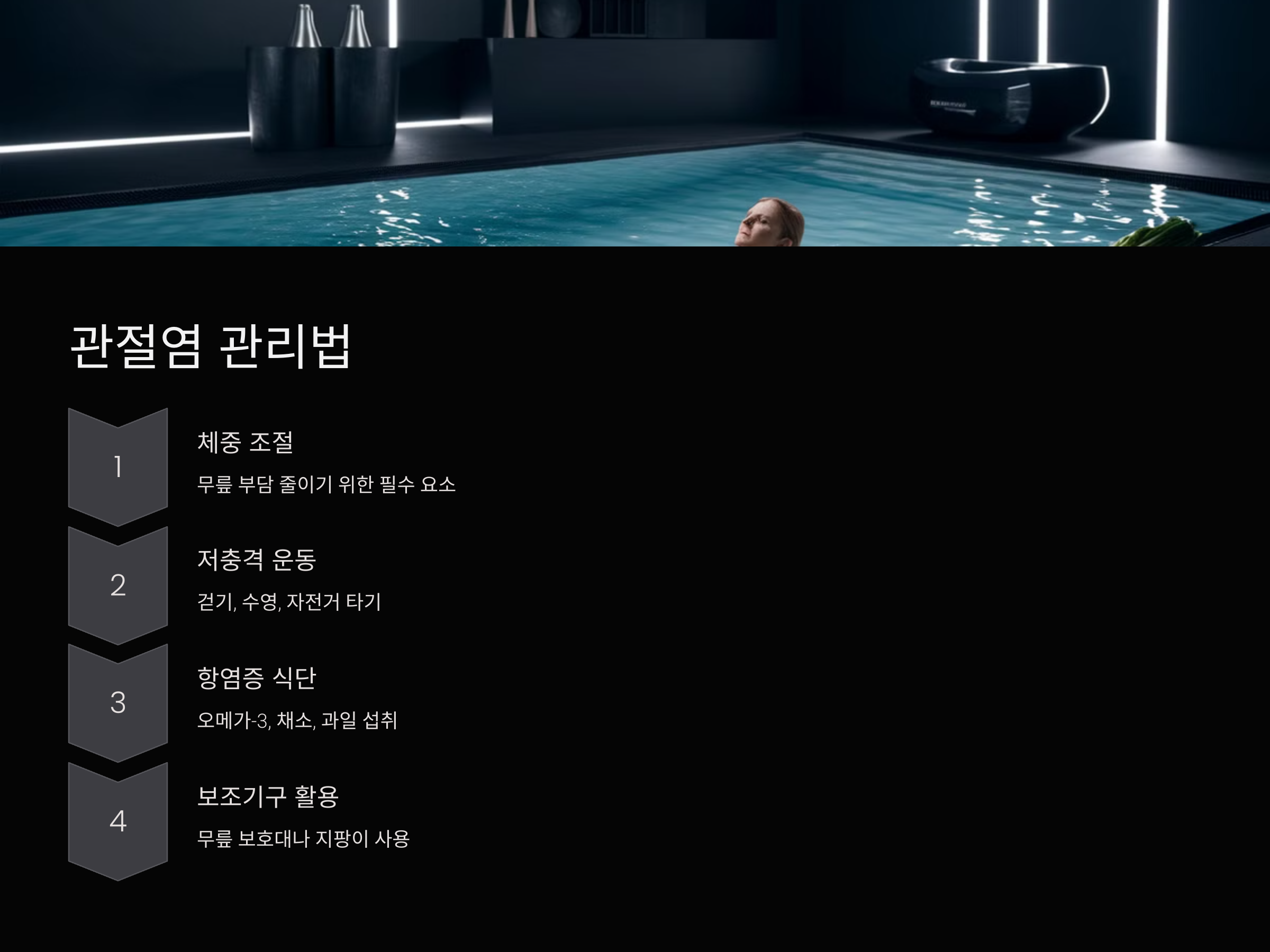 - 적절한 운동: 걷기, 수영, 자전거 타기 등의 저충격 운동이 도움됨