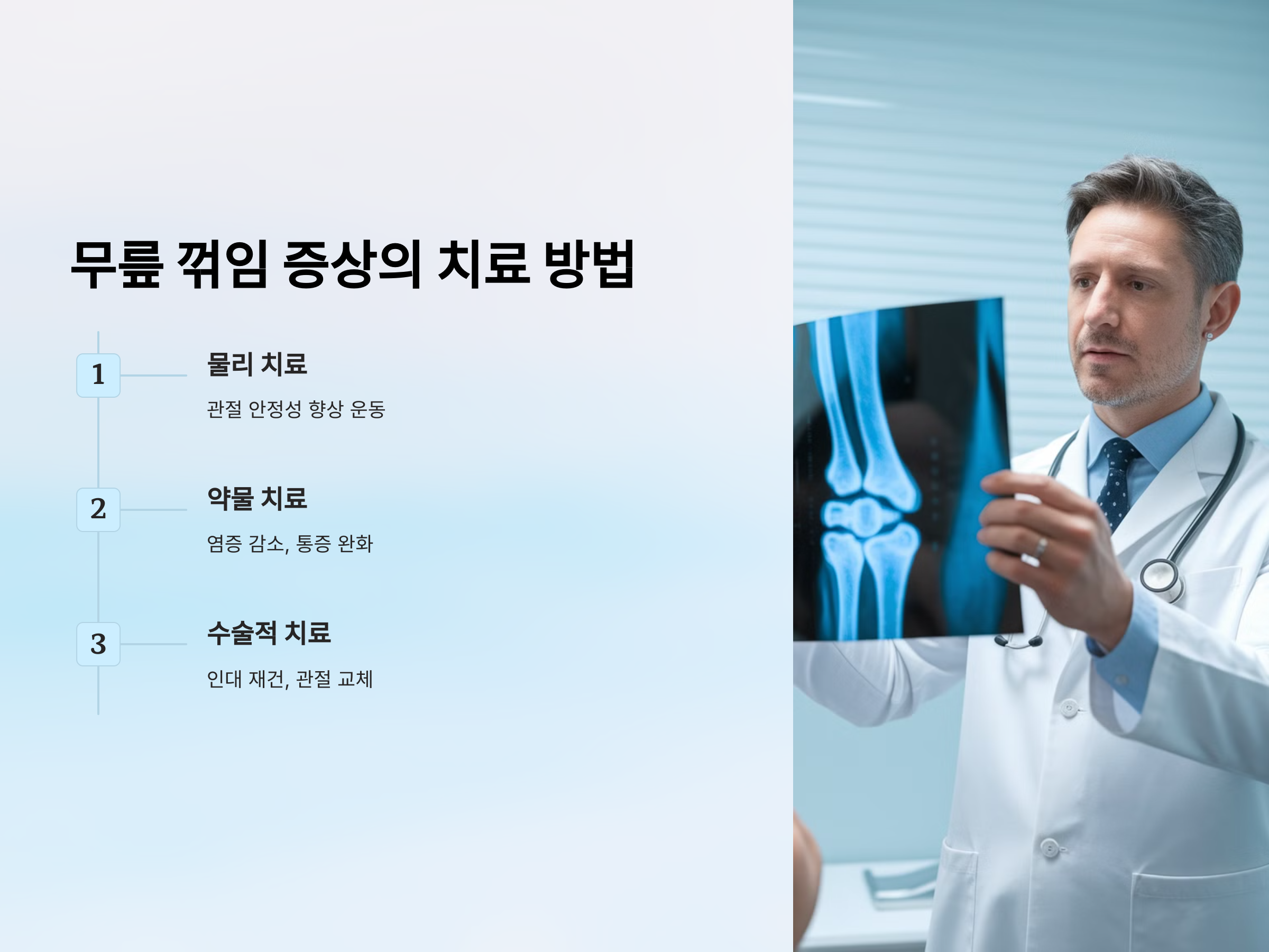 하지만 심한 꺾임이나 지속적인 통증이 동반될 경우, 수술적인 치료가 필요할 수 있습니다. 예를 들어, 인대 재건 수술이나 관절 교체 수술 등을 통해 무릎의 기능을 회복할 수 있습니다. 수술 후에는 재활 치료가 필수적입니다.