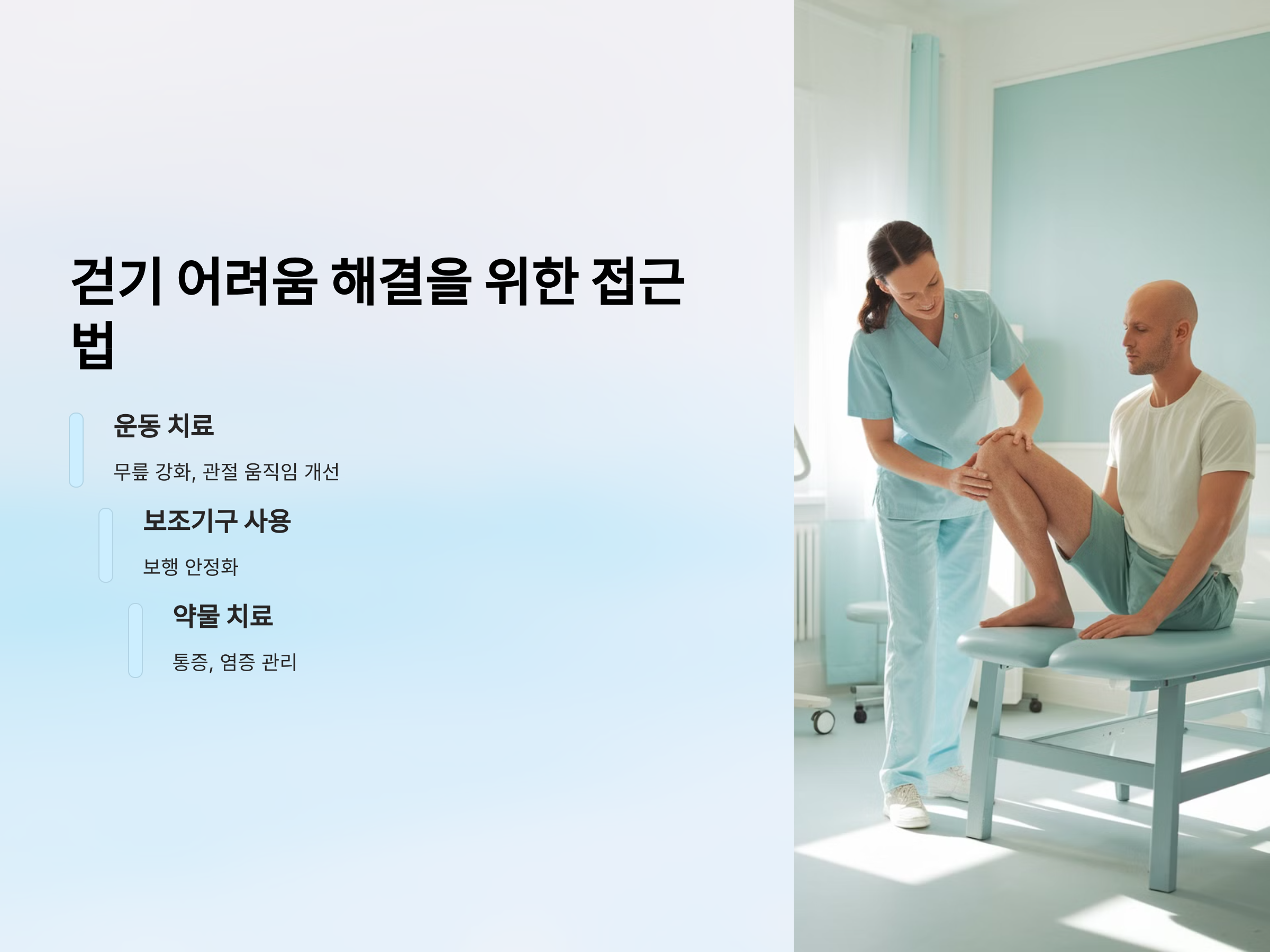 걷기 어려움이 지속되는 경우, 관절의 기능을 회복하는 것이 중요합니다. 보통 걷기 어려운 원인은 근육 약화, 인대 손상, 관절염 등에서 발생합니다. 따라서 운동 치료와 물리 치료를 통해 무릎을 강화하고, 관절을 원활하게 움직이게 만드는 방법이 필요합니다.