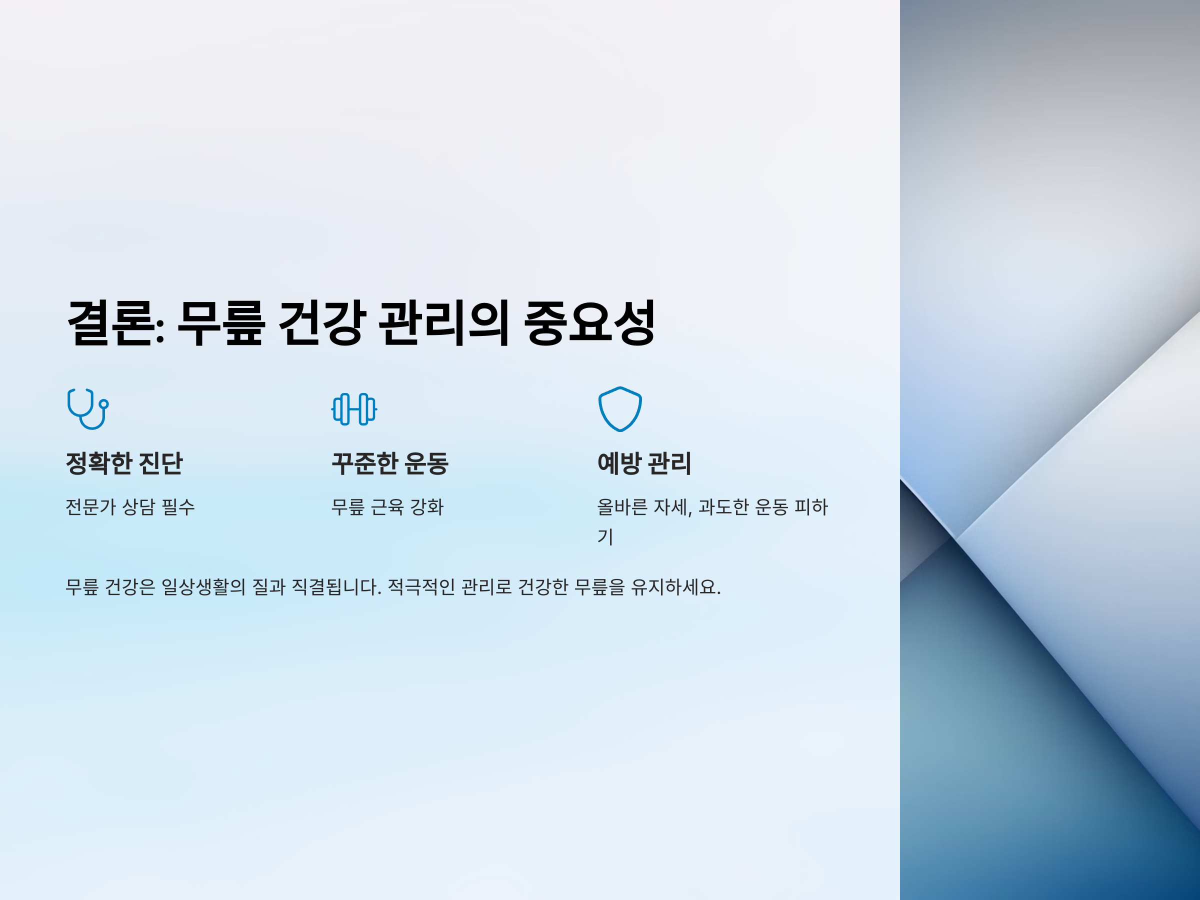 그러나 심한 경우에는 수술적 치료가 필요할 수 있습니다. 특히 인대나 연골이 심하게 손상된 경우, 재건 수술을 통해 무릎의 기능을 회복시키는 방법이 필요할 수 있습니다. 수술 후에는 충분한 재활 치료와 관리가 필요합니다.