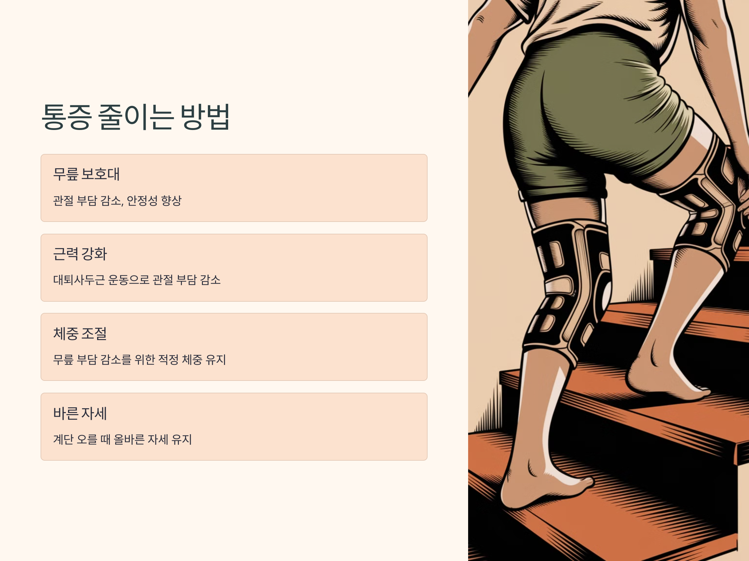 - 바른 자세 유지 – 계단 오를 때 무릎을 과하게 굽히지 않기