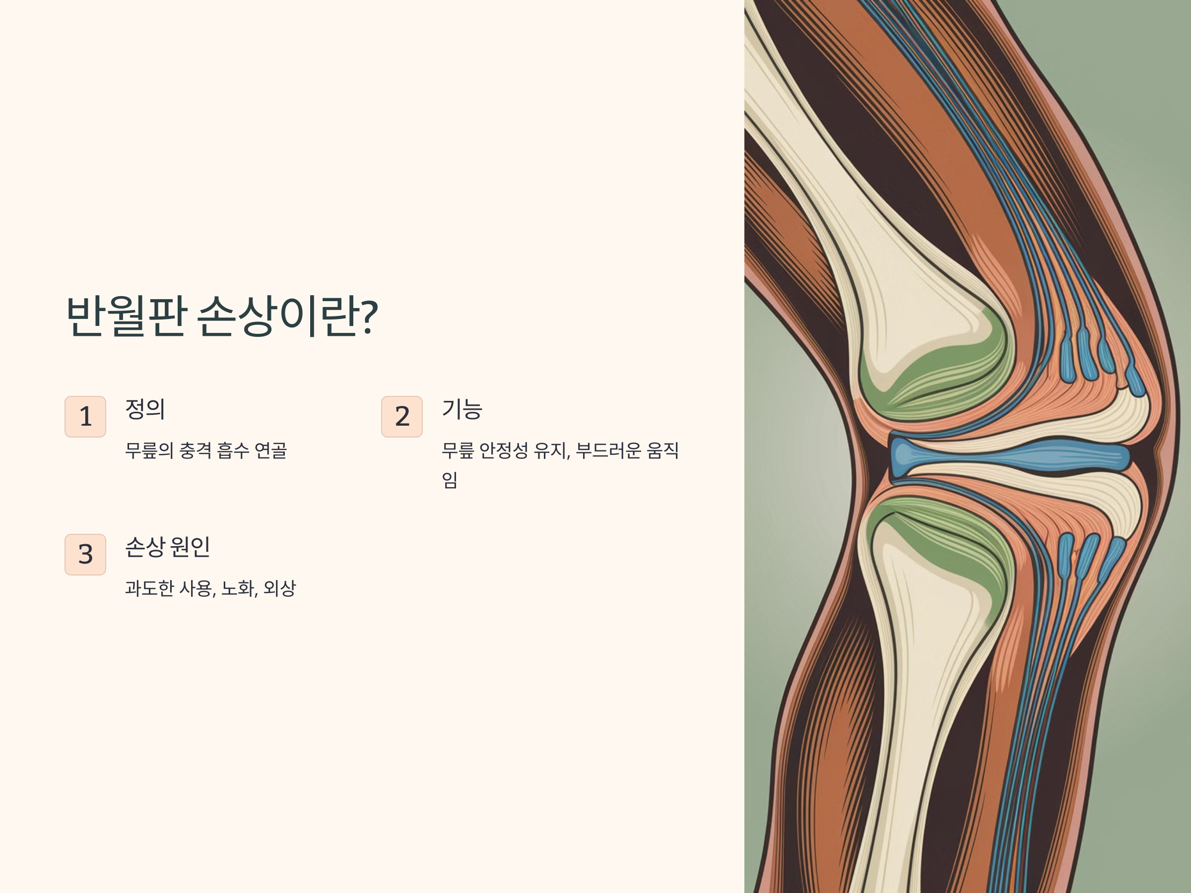 무릎 반월판은 허벅지뼈와 정강이뼈 사이에서 충격을 흡수하는 반달 모양의 연골입니다. 이 구조물은 무릎의 안정성을 유지하는 데 필수적이며, 부드럽게 움직일 수 있도록 돕습니다. 하지만 과도한 사용, 노화, 외상 등의 원인으로 손상될 수 있습니다.