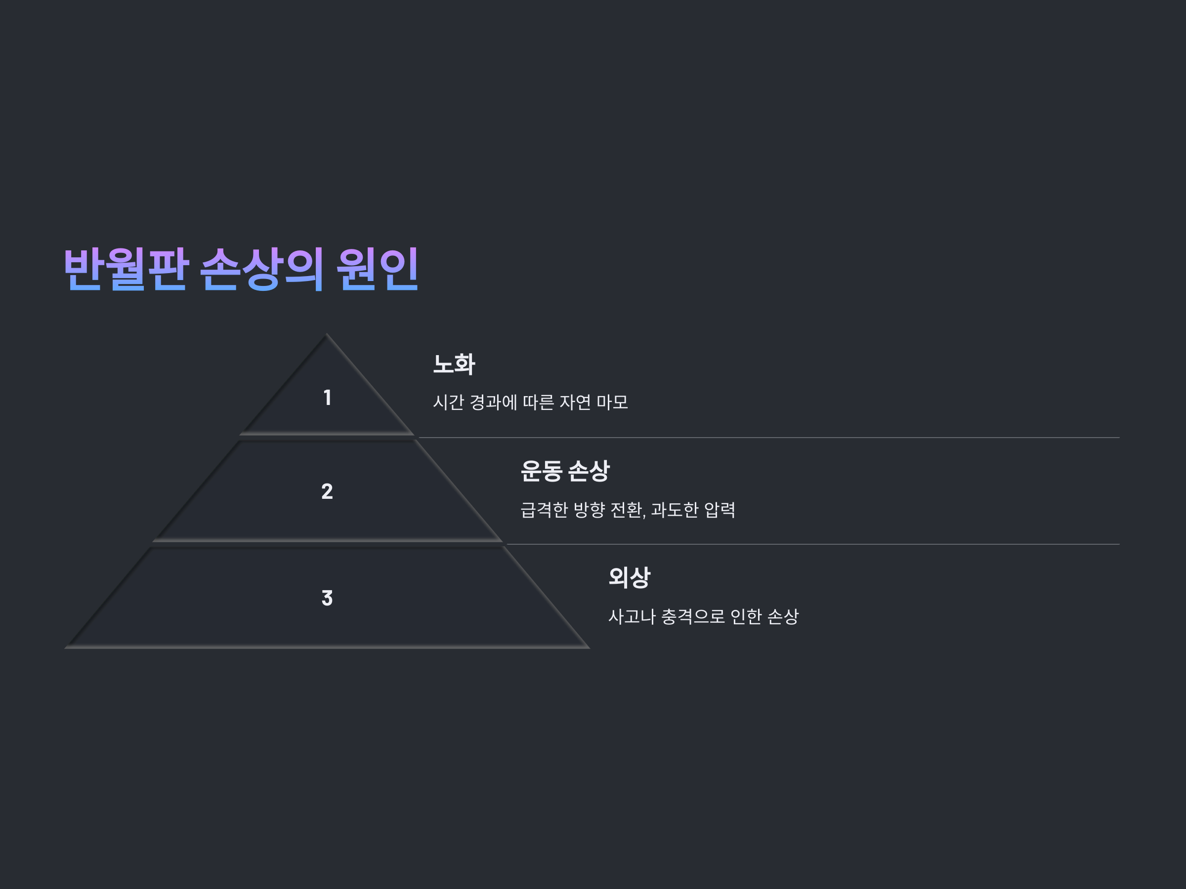 반월판 손상은 다양한 원인에 의해 발생할 수 있습니다. 외부 충격이나 무리한 운동, 혹은 나이가 들면서 반월판이 마모되면서 손상이 일어날 수 있습니다. 특히, 급격한 방향 전환이나 무릎에 부담을 주는 운동에서 손상의 위험이 큽니다. 예를 들어, 축구, 농구, 달리기와 같은 스포츠에서 빠른 방향 전환이나 점프 후 착지 시 무릎에 과도한 압력이 가해질 수 있습니다.