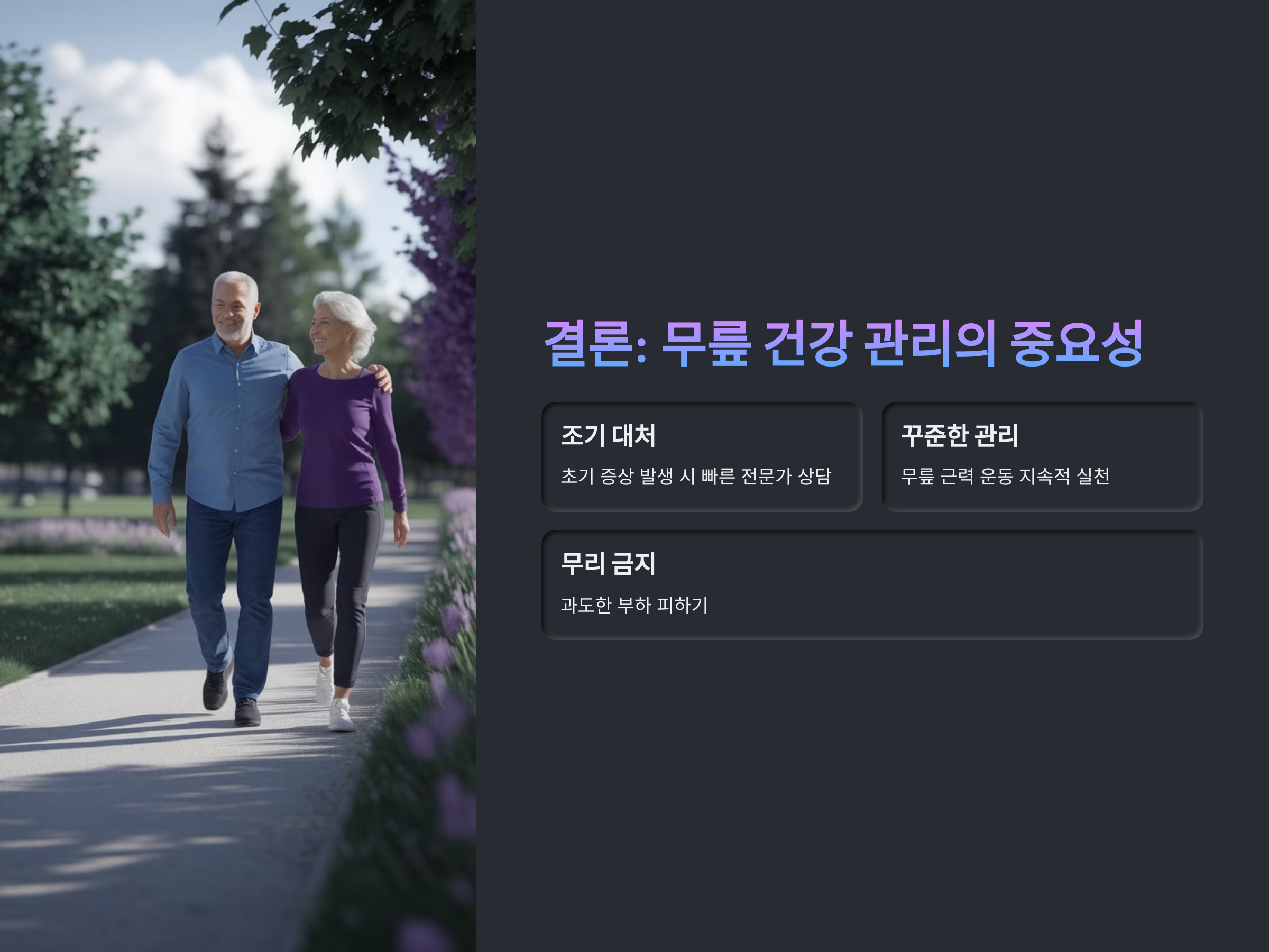 무릎 반월판 손상의 치료와 예방을 위해 꾸준한 관리와 조기 치료가 중요합니다. 초기 증상이 있을 때 빠르게 대처하고, 무릎에 과도한 부하를 주지 않는 것이 장기적인 건강을 지키는 방법입니다.