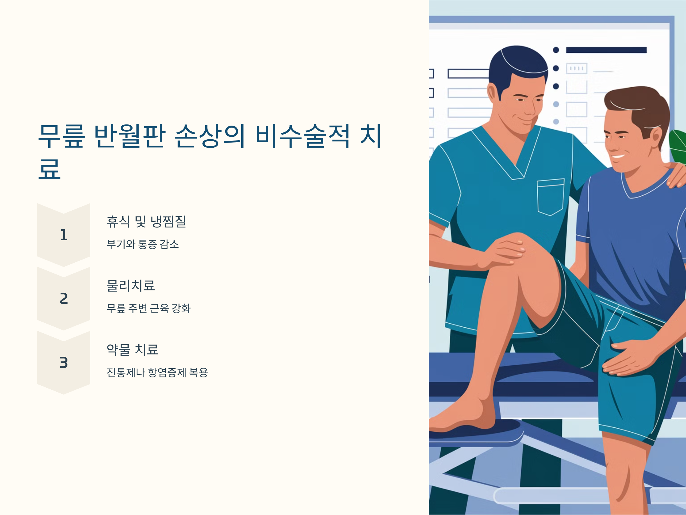 무릎 반월판 손상의 치료는 손상의 정도와 환자의 상태에 따라 다르게 접근합니다:
