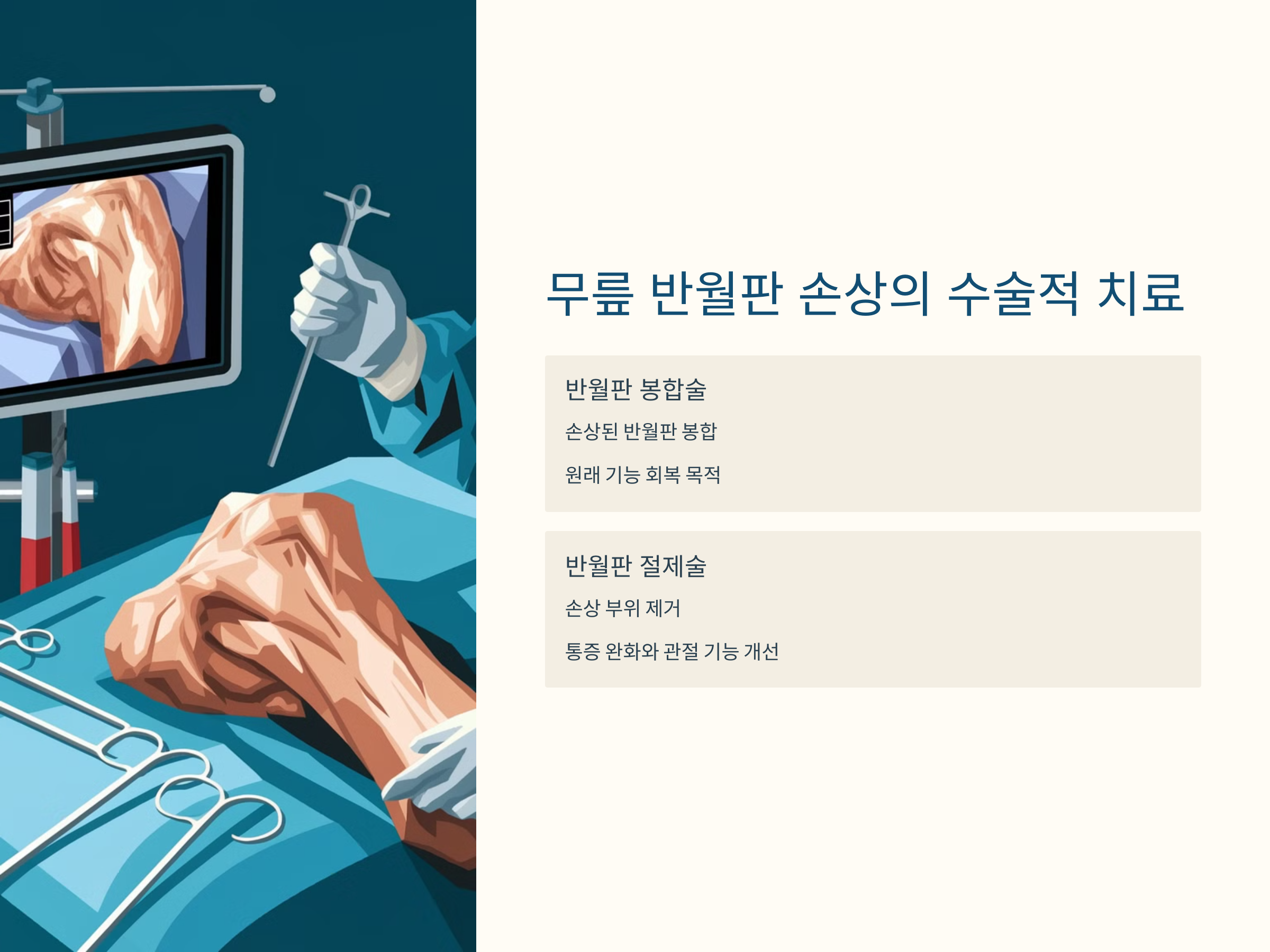 - 반월판 절제술: 손상 부위를 제거하여 통증을 완화하고 관절의 기능을 개선합니다.