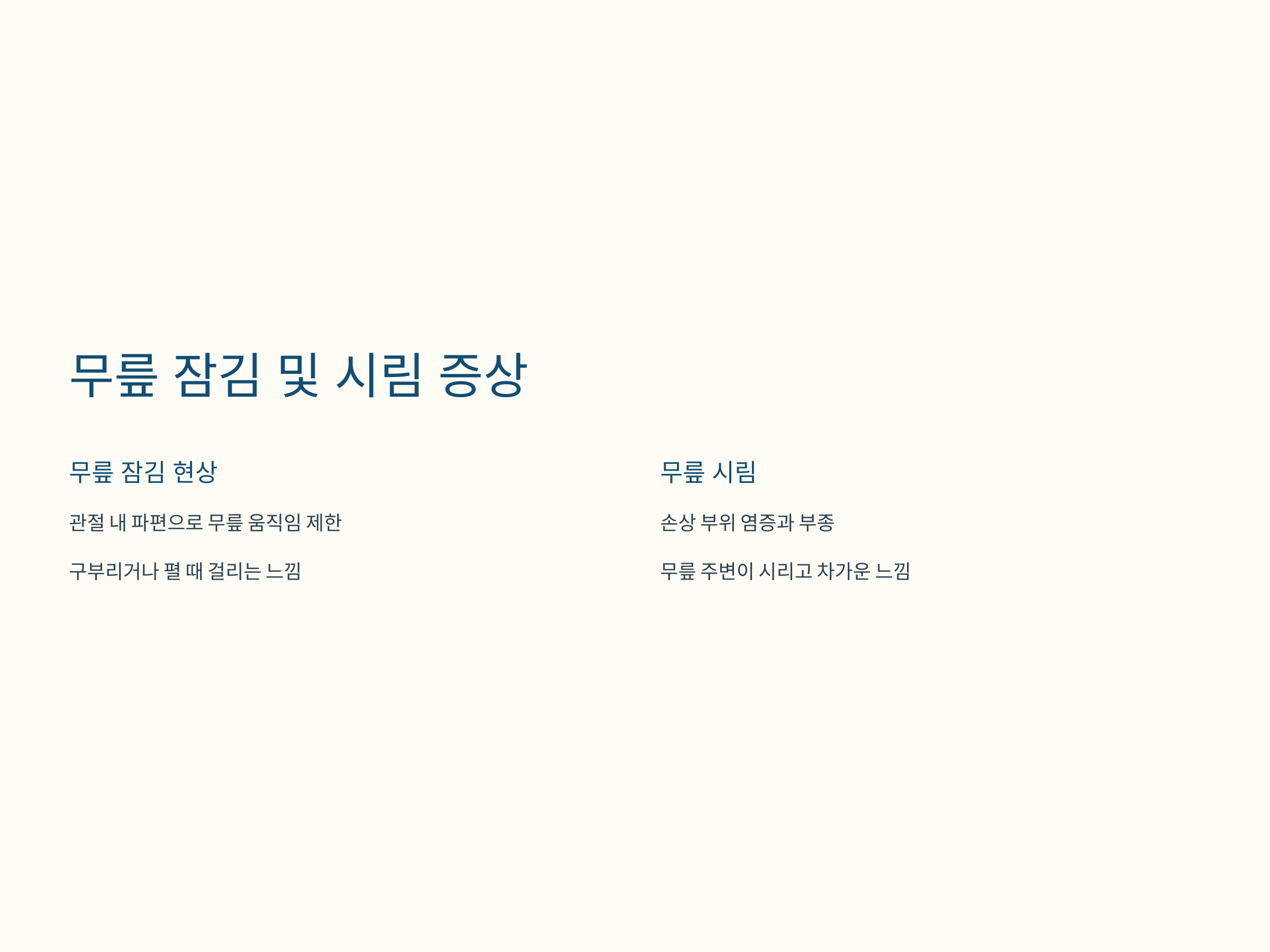 - 무릎 시림: 손상 부위의 염증과 부종으로 인해 무릎 주변이 시리고 차가운 느낌을 받을 수 있습니다.