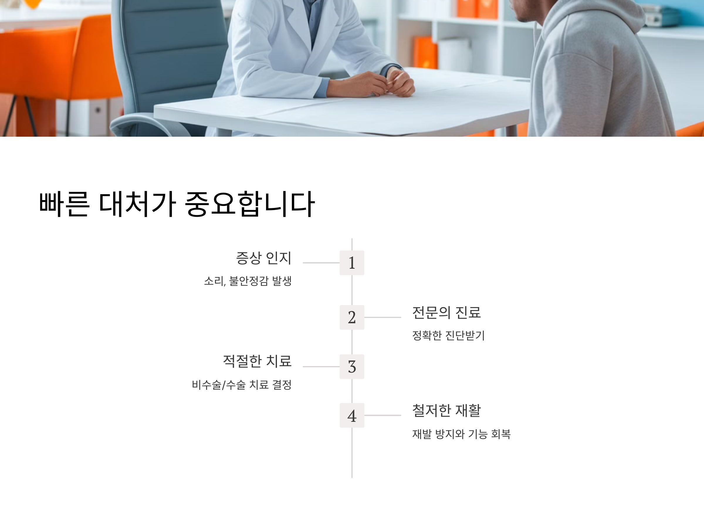 무릎에서 소리나 불안정한 느낌을 경험한다면, 이를 방치하지 말고 빠른 시일 내에 전문의의 진료를 받는 것이 중요합니다. 반월판 파열은 초기에는 증상이 미미할 수 있지만, 시간이 지날수록 통증과 불안정성이 심해지며, 치료가 어려워질 수 있습니다. 적절한 치료와 재활을 통해 무릎 기능을 회복하고, 다시는 동일한 문제로 고통받지 않도록 해야 합니다.