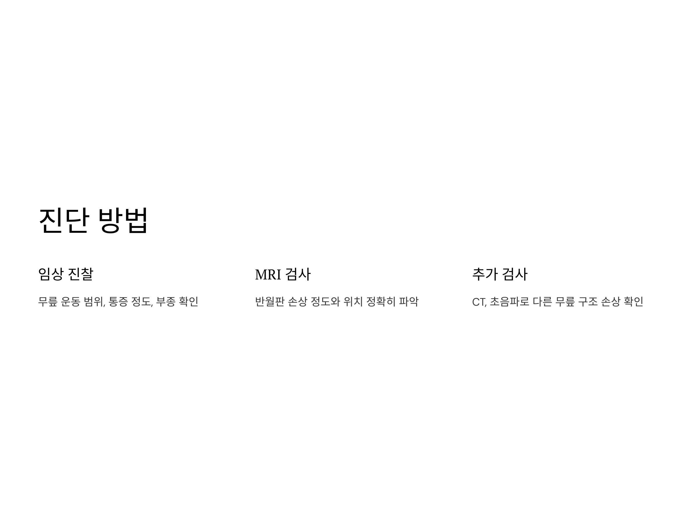 반월판 파열을 진단하는 방법은 크게 임상 증상과 영상 진단을 통해 이루어집니다. 우선, 무릎에서 소리나 불안정성을 느꼈다면, 전문의와 상담을 통해 기초적인 진료를 받는 것이 중요합니다. 이를 통해 무릎의 운동 범위, 통증의 정도, 부종 등을 확인하고, 추가적인 검사를 진행할 수 있습니다.