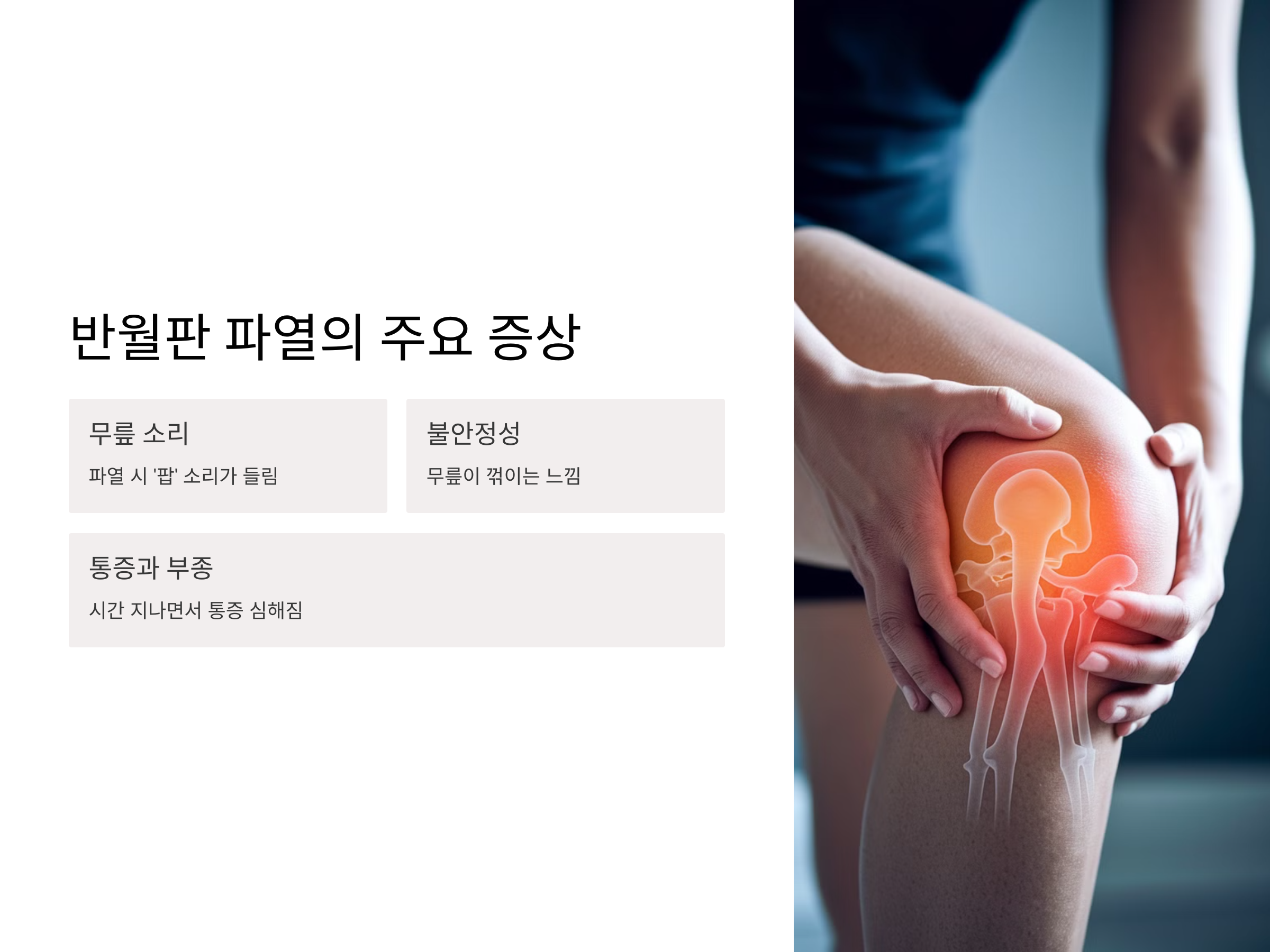 반월판 파열의 주요 증상으로는 무릎에서 소리(팝 소리)와 불안정성이 있습니다. 초기에는 소리가 나기만 하고 특별한 통증은 없을 수 있지만, 시간이 지나면서 무릎의 움직임이 불안정해지고 통증이 동반될 수 있습니다. 파열이 심할 경우, 무릎이 제대로 움직이지 않거나 부종이 생기는 경우도 많습니다. 또, 걸을 때 무릎에 걸리는 느낌이나, 무릎이 자꾸 꺾이는 듯한 불안정감을 느낄 수 있습니다.