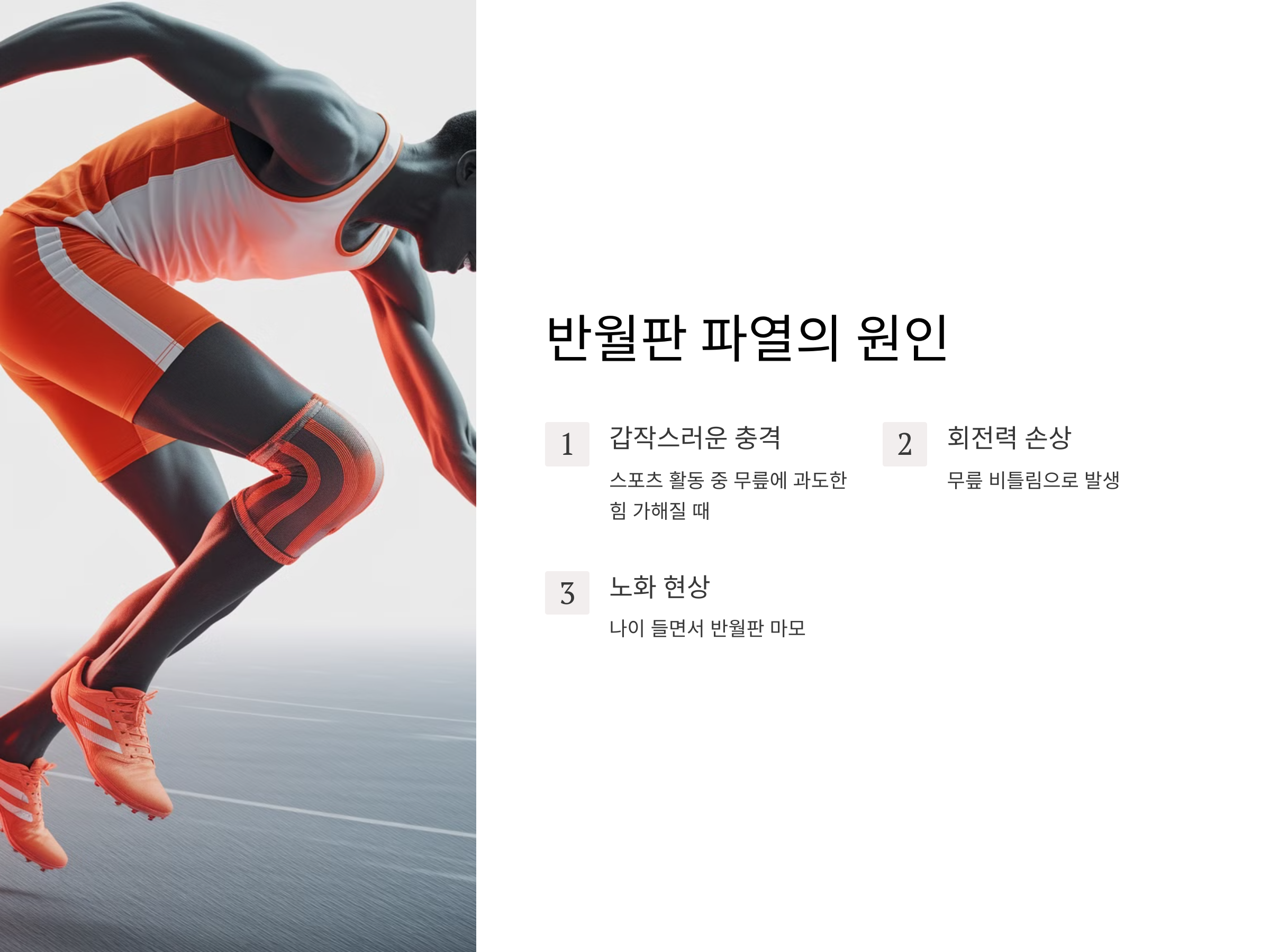 무릎의 반월판 파열은 운동이나 사고, 혹은 나이가 들면서 발생할 수 있습니다. 특히 고강도 운동이나 스포츠를 자주 하는 사람들은 반월판 파열의 위험이 더 큽니다. 또한, 일상적인 생활에서도 잘못된 자세나 과도한 하중이 무릎에 가해지면 반월판에 손상이 발생할 수 있습니다. 만약 무릎에서 소리가 나고 불안정한 느낌이 지속된다면, 즉시 전문적인 진료를 받는 것이 중요합니다.