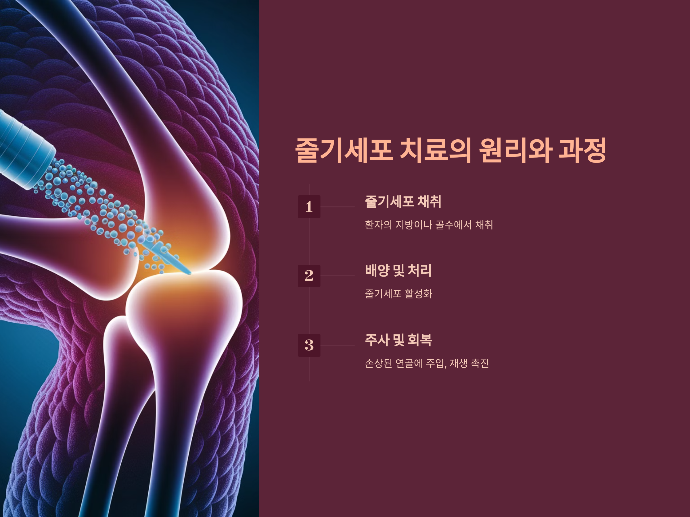 줄기세포 치료는 손상된 조직을 재생하고 회복시키는 능력이 있는 줄기세포를 활용하는 방법입니다. 특히 자기 조직 줄기세포를 이용한 치료가 많이 사용되며, 이 치료법은 무릎 연골 손상 뿐만 아니라 다양한 조직 재생에도 효과적입니다.