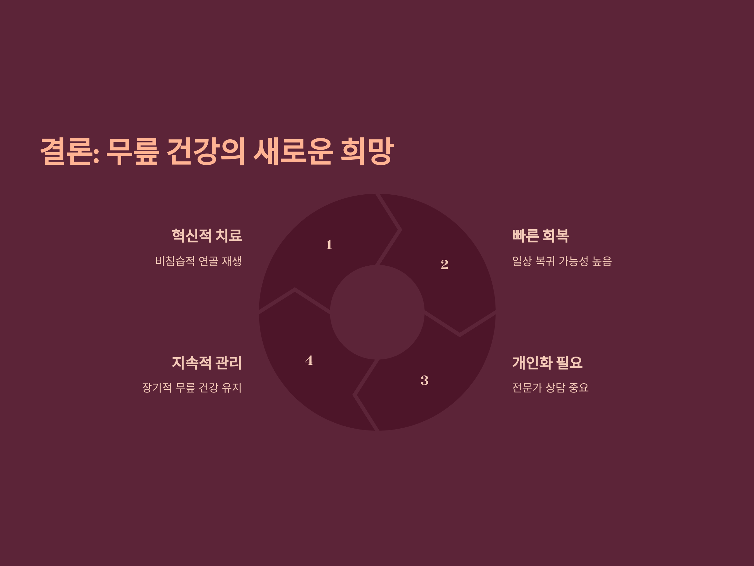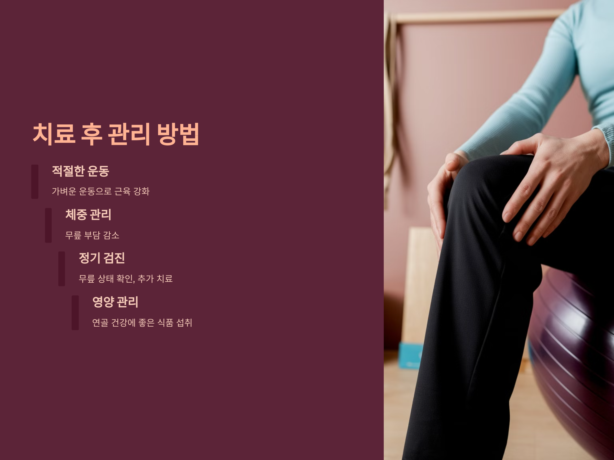 - 정기적인 추적 검사: 치료 후에는 정기적으로 무릎 상태를 확인하고, 필요한 경우 추가적인 치료를 받는 것이 좋습니다.