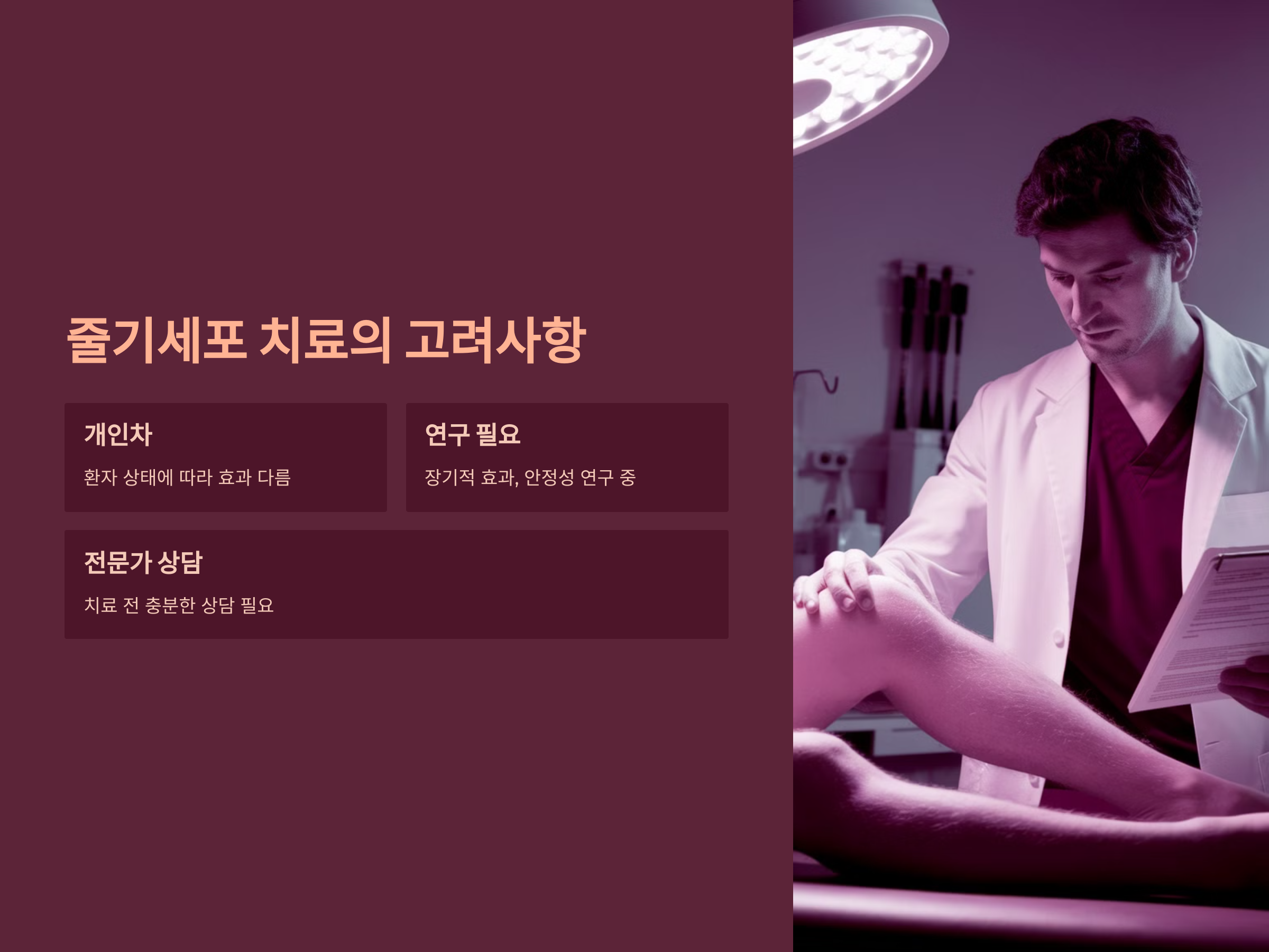 하지만 모든 환자에게 적용 가능한 치료는 아니며, 환자의 상태에 따라 치료 효과가 다를 수 있습니다. 또한, 줄기세포 치료는 비교적 새로운 치료법으로, 장기적인 효과와 안정성에 대한 연구가 더 필요합니다.