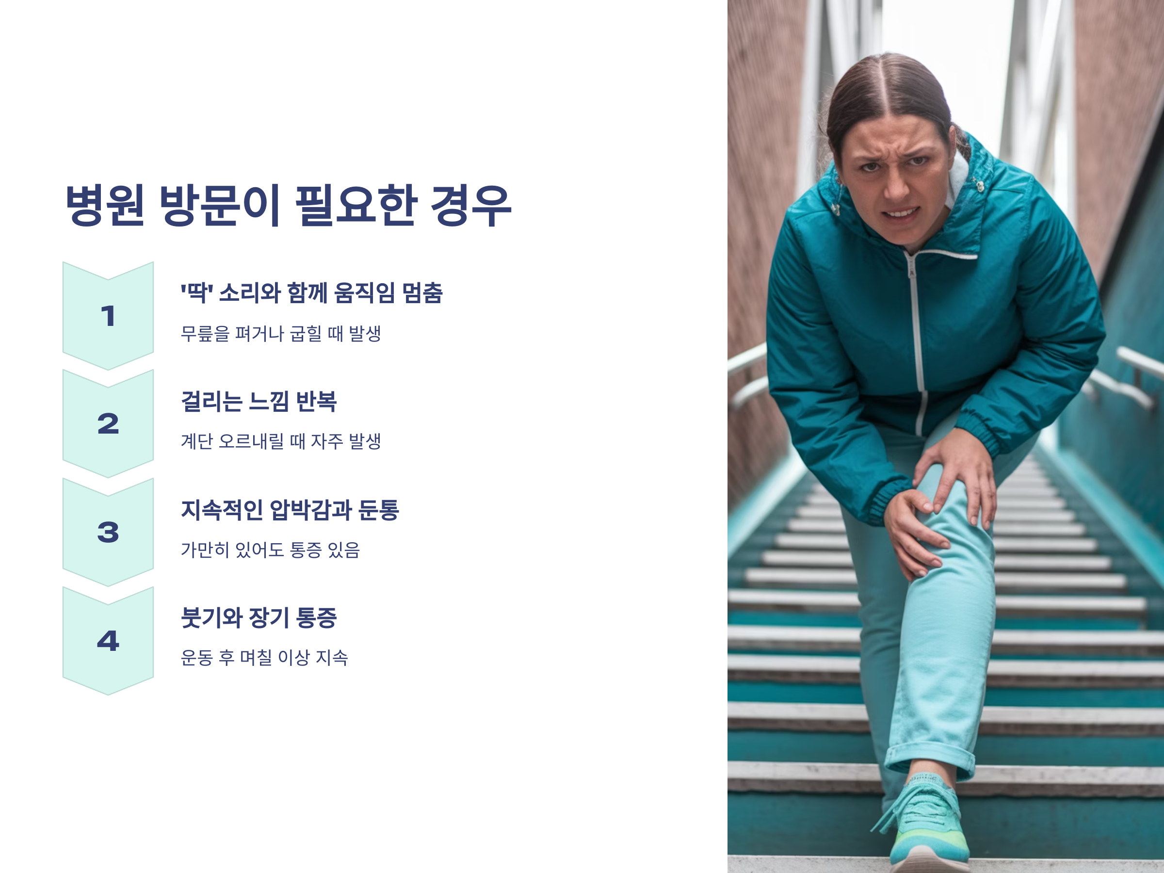 - 운동 중 또는 이후에 무릎이 붓고, 통증이 며칠 이상 지속된다