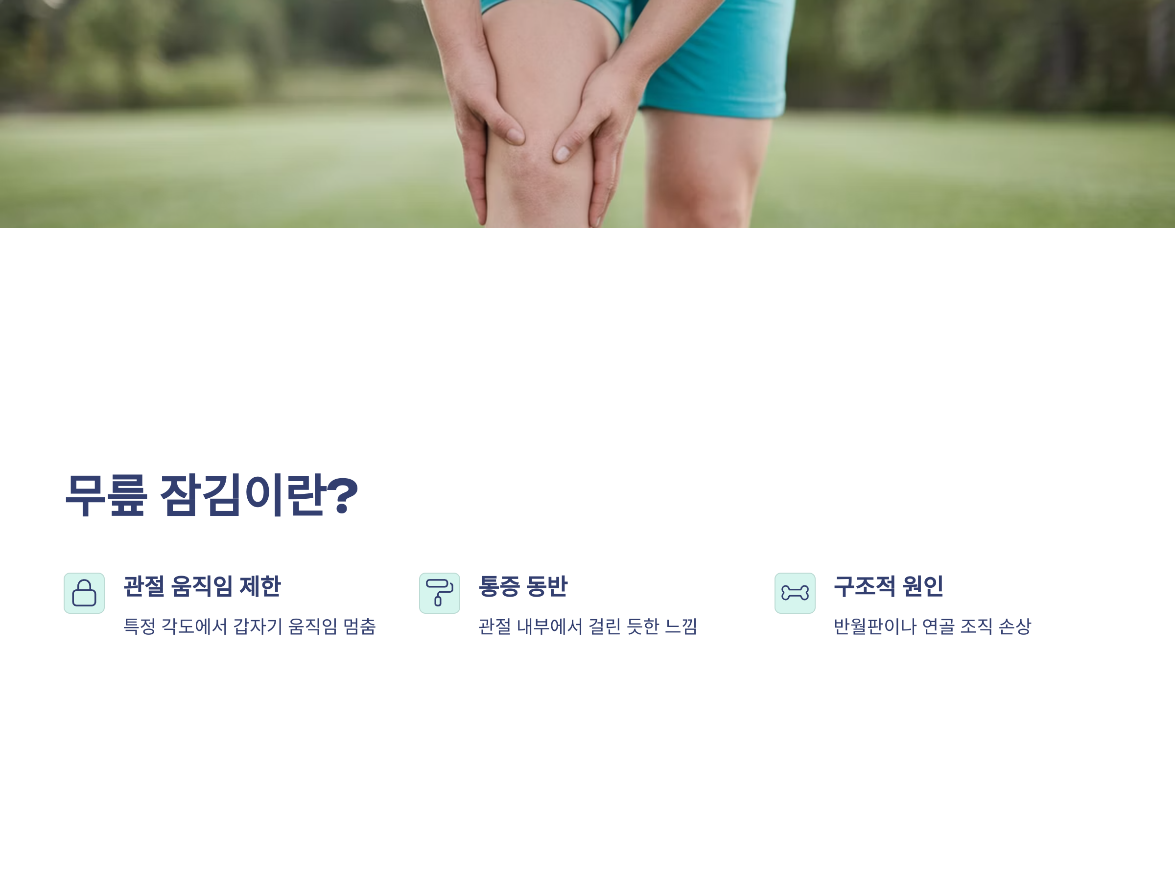 무릎 잠김이란, 관절을 펴거나 굽힐 때 특정 각도에서 갑자기 움직임이 멈추고 통증이 동반되는 현상을 말합니다. 마치 무언가 관절 내부에서 걸린 듯한 느낌이 들며, 의도적으로 펴거나 굽히기 어려워지는 것이 특징입니다. 일반적으로 이는 관절 내 구조물—특히 반월판이나 연골 조직이—찢어지거나 어긋나면서 발생합니다.