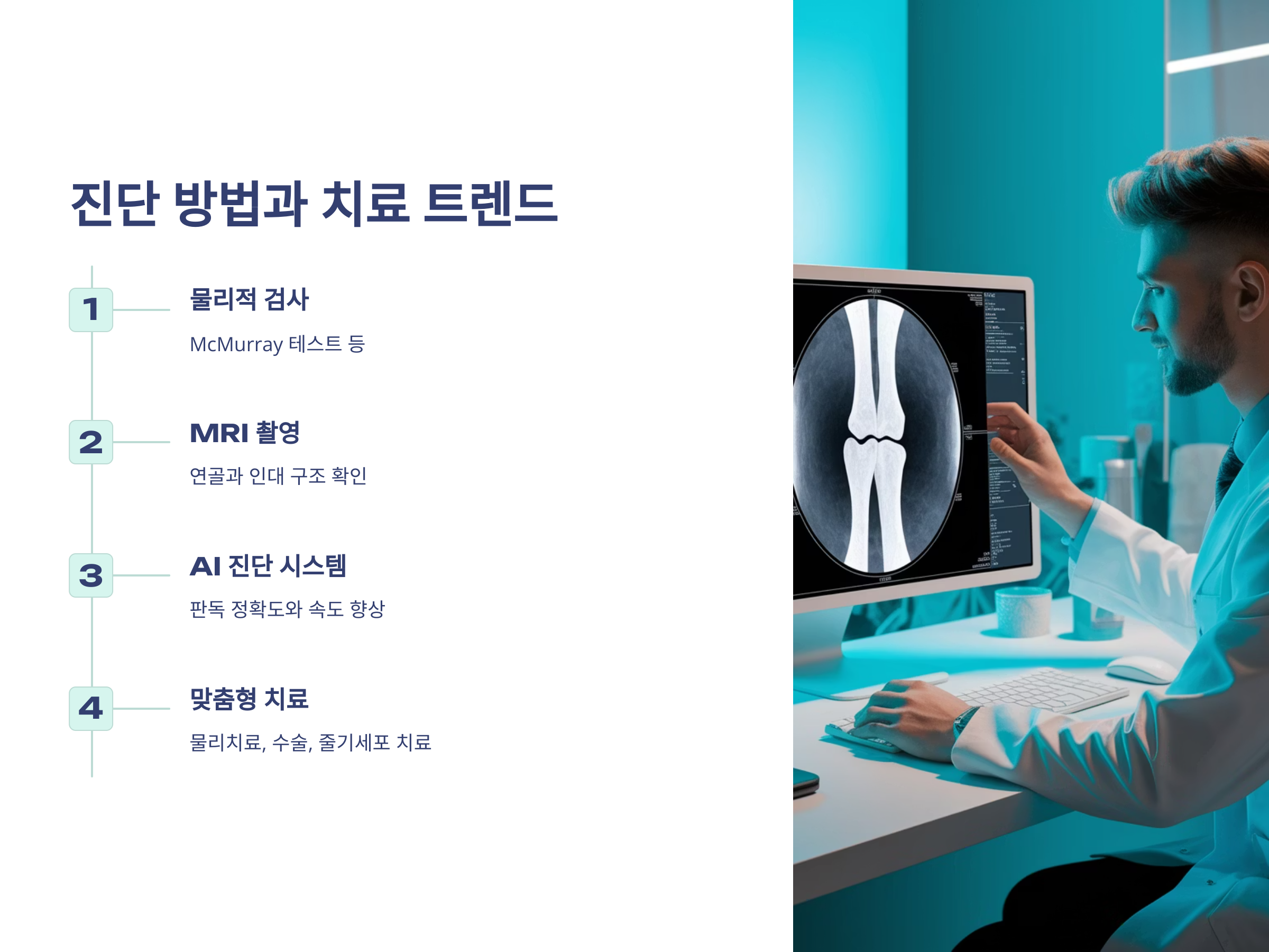 진단은 병원에서 물리적 검사(McMurray test 등)와 MRI 촬영을 통해 이루어집니다. MRI는 연골과 인대 구조까지 정밀하게 확인할 수 있어 반월판 손상의 위치와 정도를 파악하는 데 매우 효과적입니다. 최근에는 AI 진단 시스템이 병원에 도입되면서 판독의 정확도와 속도가 향상되었습니다.