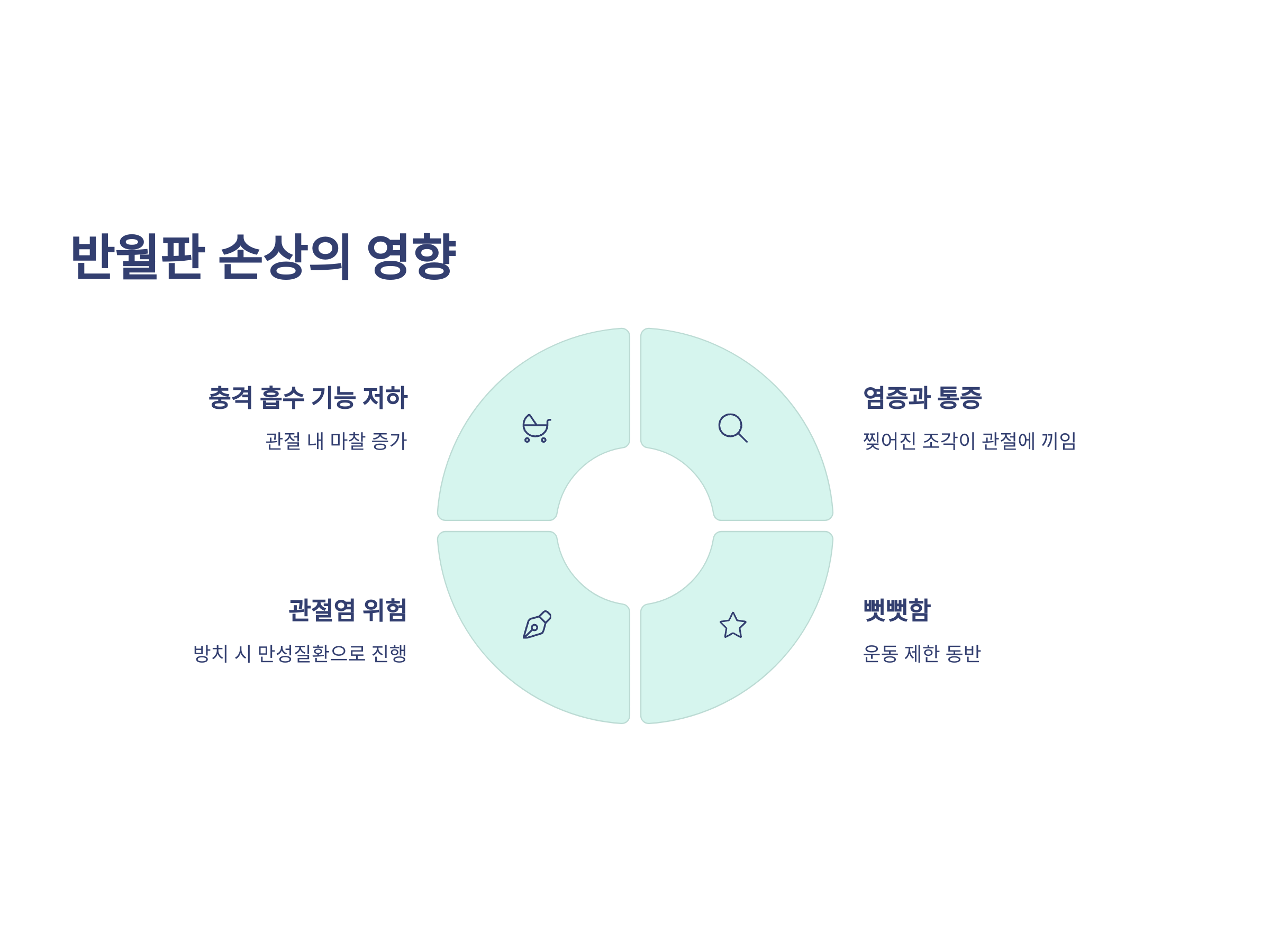 반월판은 무릎 뼈 사이에 존재하는 C자 모양의 연골로, 충격을 흡수하고 관절의 움직임을 부드럽게 하는 역할을 합니다. 이 조직이 손상되면 충격 흡수가 제대로 되지 않고 관절 내 마찰이 증가해 염증과 통증이 동반됩니다. 특히 찢어진 반월판 조각이 관절 틈 사이에 끼일 경우, 무릎이 잠기는 증상이 발생하며, 심하면 뻣뻣함과 운동 제한이 동반됩니다.