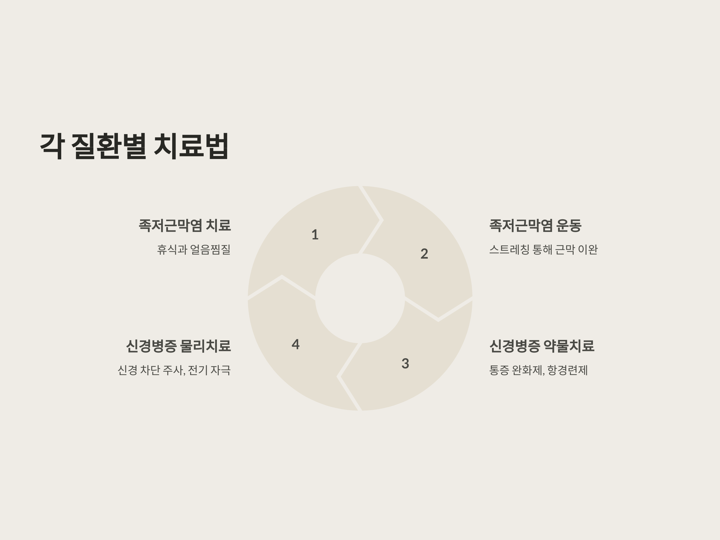 족저근막염은 휴식과 얼음찜질, 스트레칭 운동 등을 통해 근막의 염증을 완화시키고 통증을 경감시킬 수 있습니다. 신경병증은 약물치료나 물리치료, 신경 차단 주사 등을 통해 증상을 완화하는 방법이 사용됩니다.