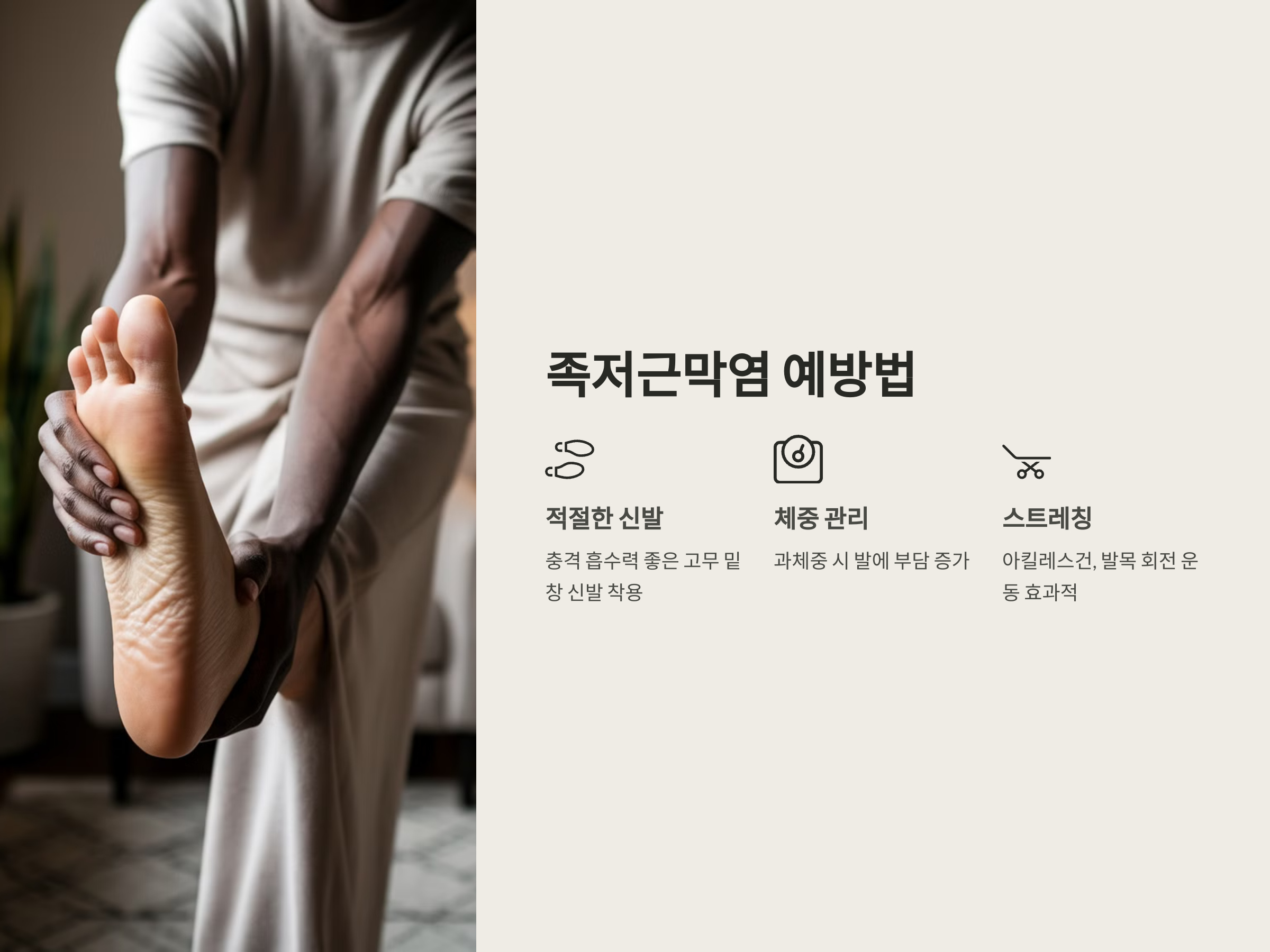 - 스트레칭과 운동: 발과 종아리 근육을 스트레칭하여 족저근막에 가해지는 압력을 줄일 수 있습니다. 예를 들어, 아킬레스건 스트레칭이나 발목 회전 운동 등이 효과적입니다.