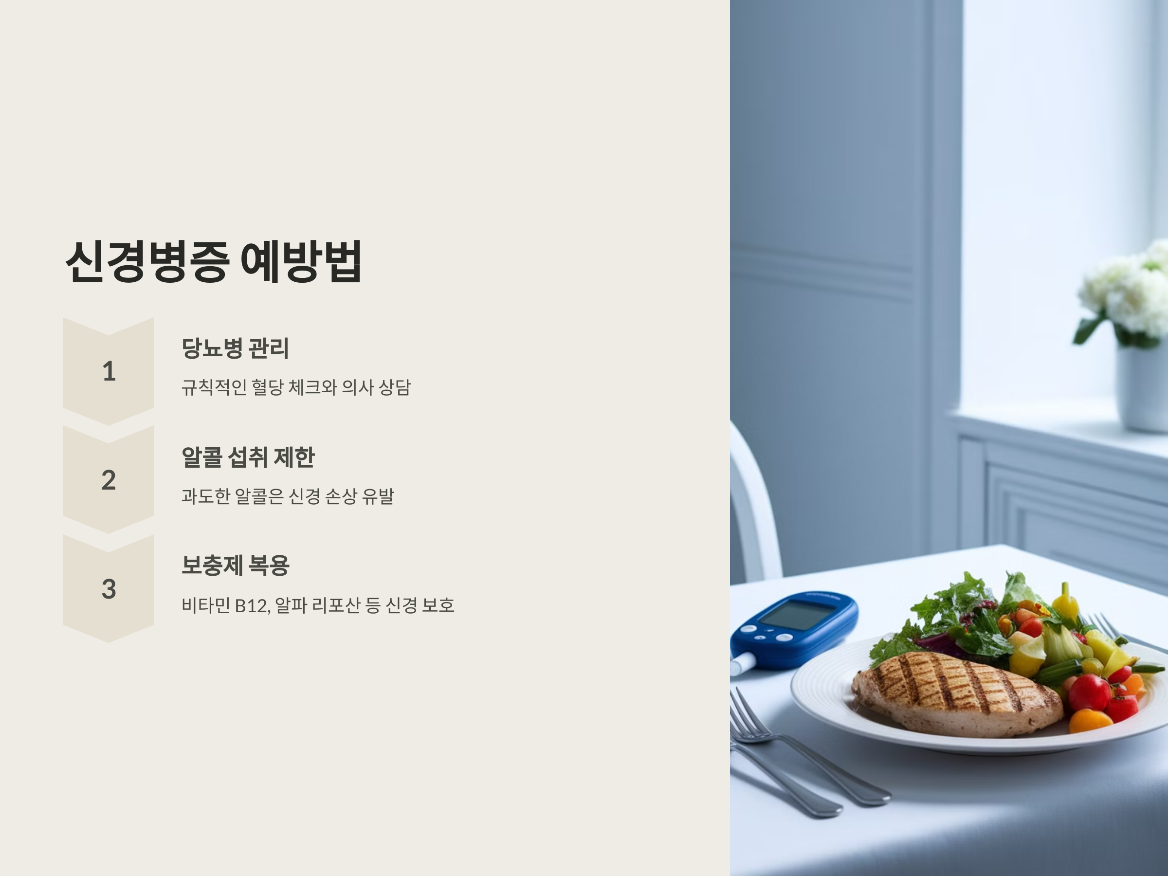 - 신경 보호 보충제 복용: 비타민 B12나 알파 리포산 등의 신경 보호 보충제를 복용하는 것도 도움이 될 수 있습니다.