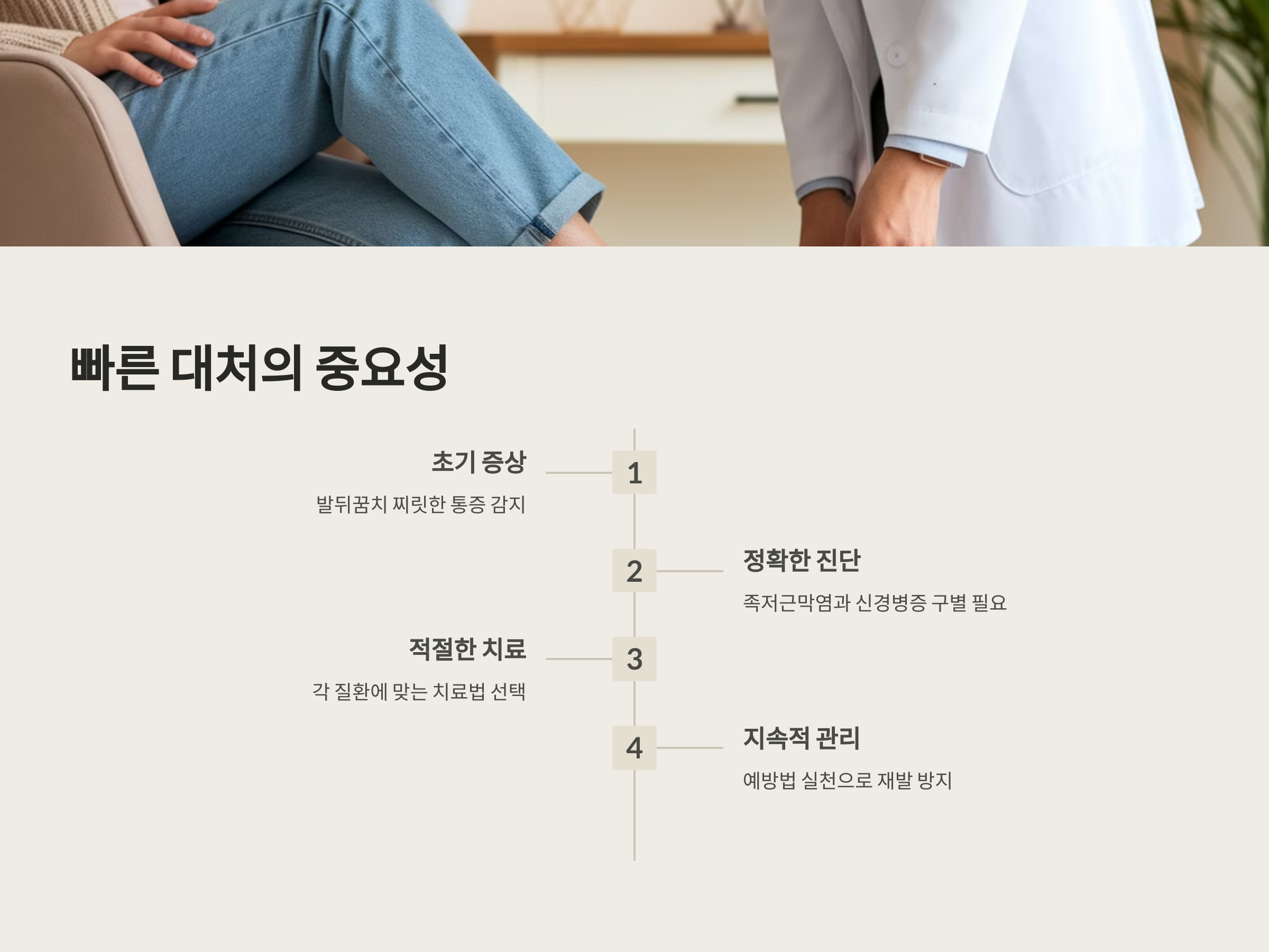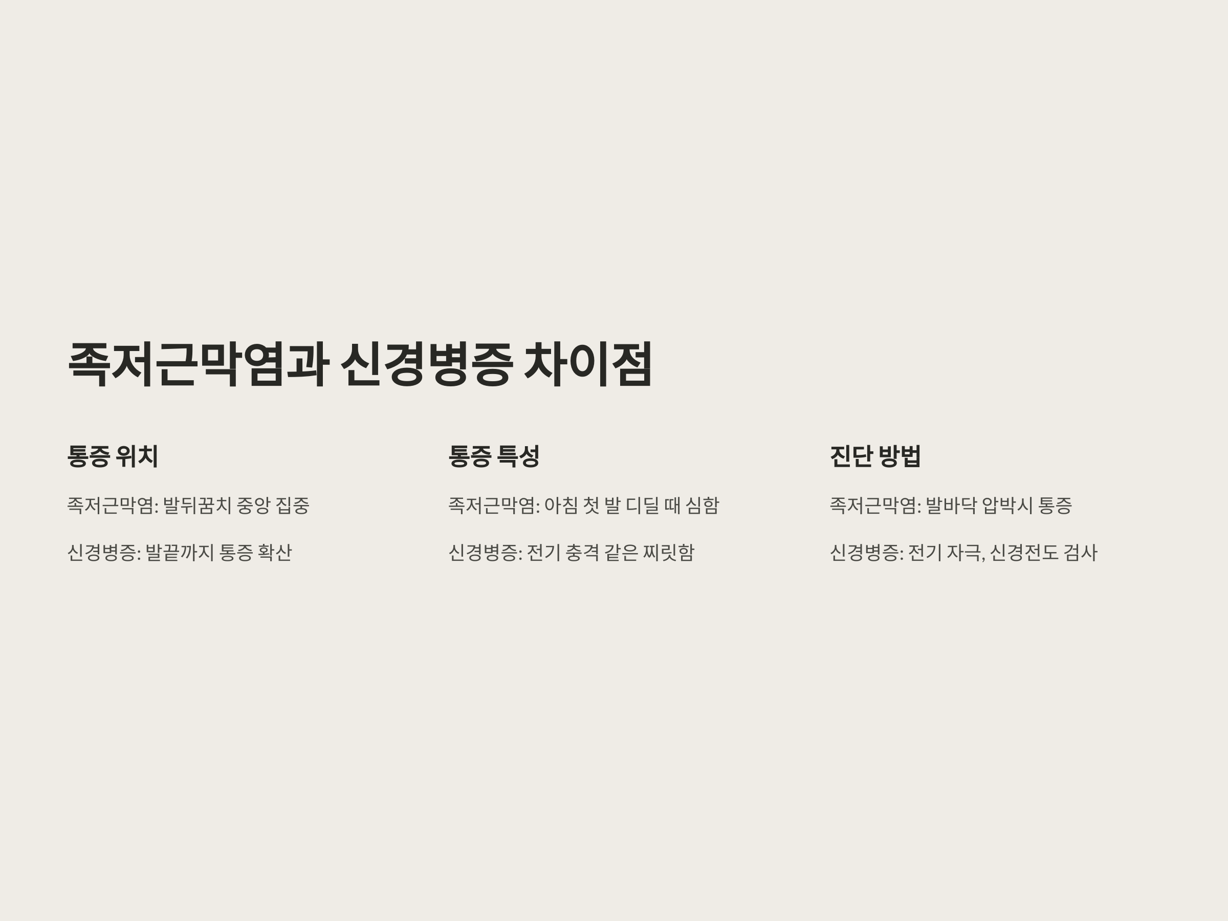 족저근막염은 주로 발뒤꿈치나 발바닥의 중앙에 통증이 집중되며, 아침에 첫 발을 디딜 때 가장 심한 통증을 느낄 수 있습니다. 반면, 신경병증은 발뒤꿈치뿐만 아니라 발끝까지 통증이 퍼질 수 있으며, 전기 충격처럼 느껴지는 찌릿한 통증이 특징입니다.