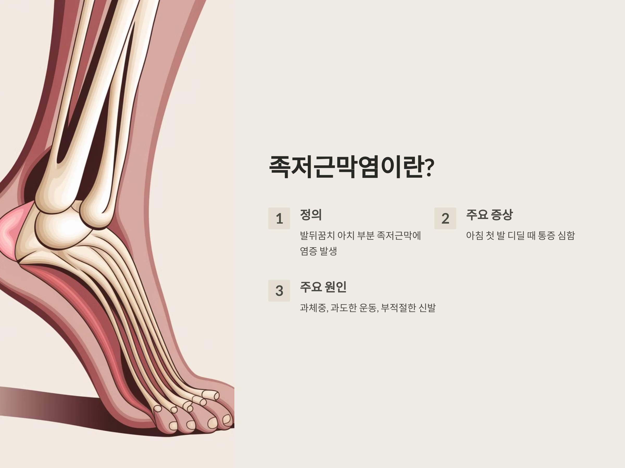 족저근막염은 발뒤꿈치의 아치 부분에 위치한 족저근막에 염증이 생기는 질환입니다. 족저근막은 발뒤꿈치에서 발끝까지 연결된 두꺼운 섬유질 조직으로, 발의 아치를 지탱하고 충격을 흡수하는 중요한 역할을 합니다. 이 근막에 과도한 압력이나 스트레스가 가해질 때 염증이 발생하며, 그 결과 발뒤꿈치에 찌릿한 통증이 발생하게 됩니다.