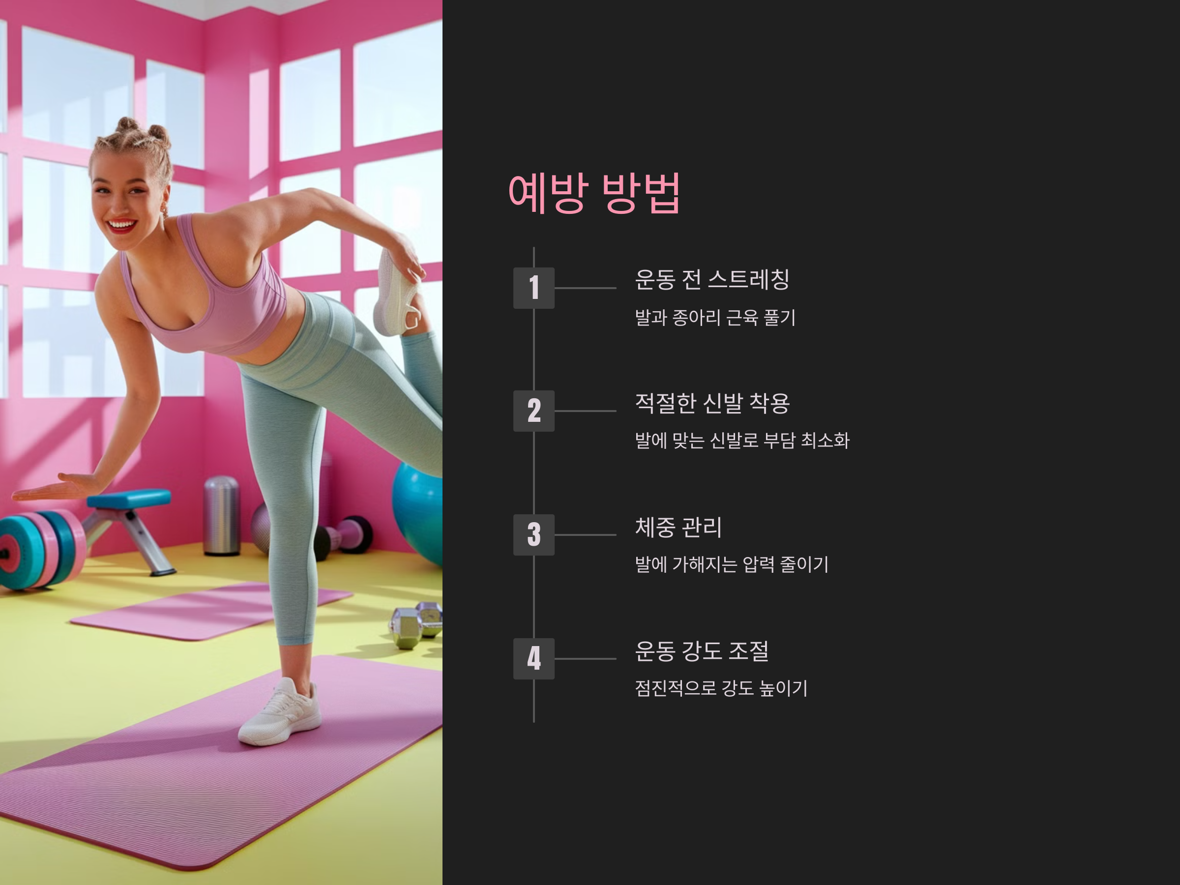- 운동 전 스트레칭: 운동 전 충분한 스트레칭을 통해 발과 종아리 근육을 풀어줍니다.