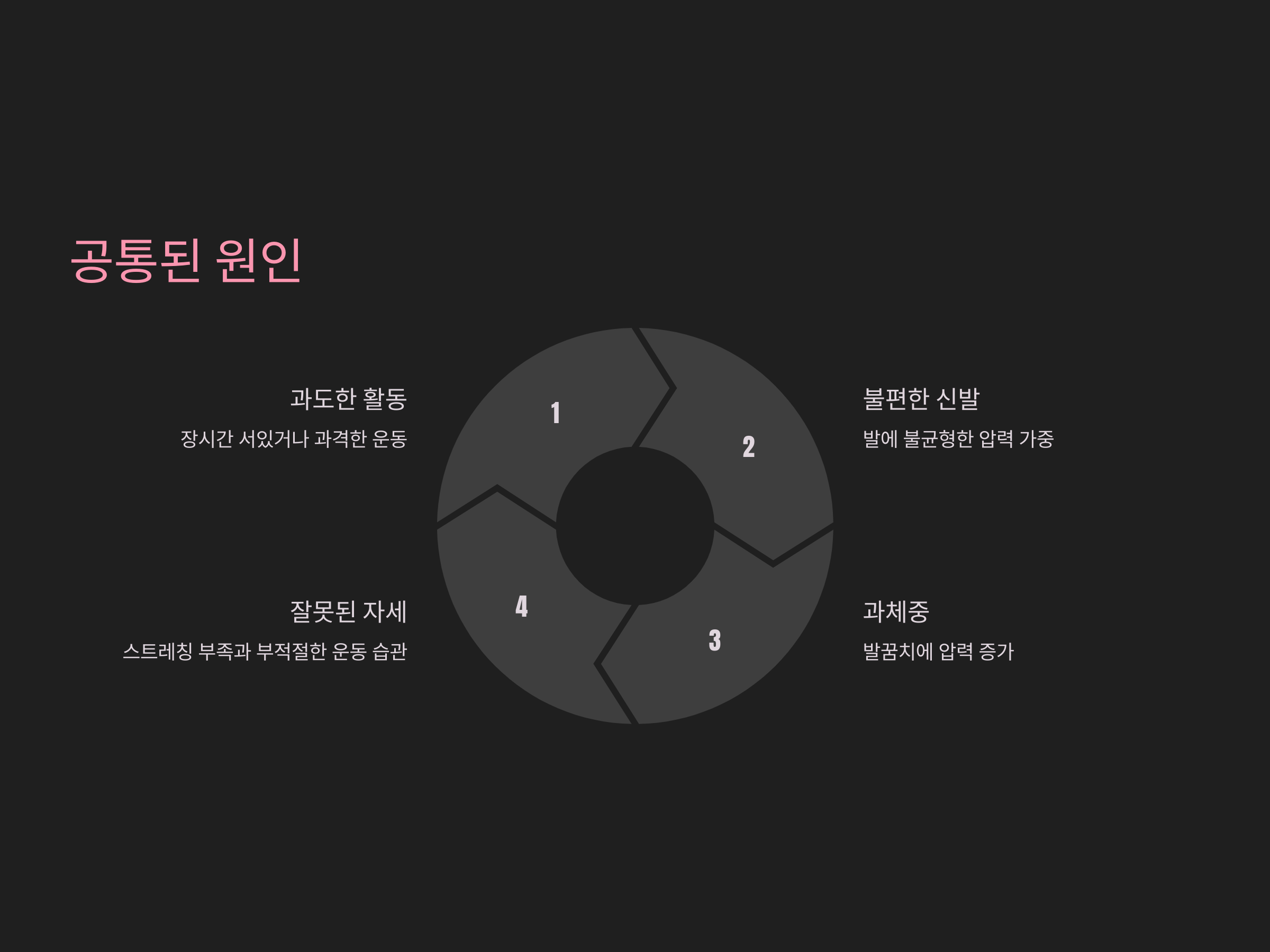 이 외에도 잘못된 운동 자세나 스트레칭 부족 등도 발뒤꿈치 통증의 원인이 될 수 있습니다.