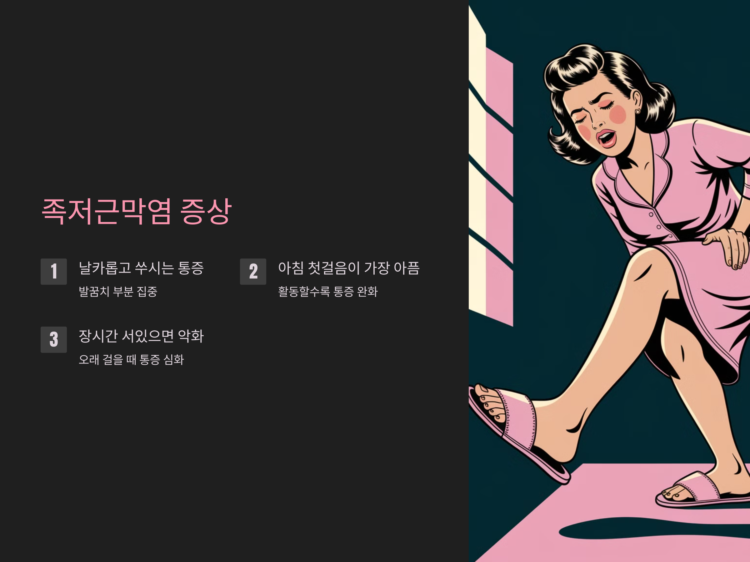 족저근막은 발꿈치에서 발가락까지 이어지는 두껍고 강한 결합 조직인데, 이 부위에 염증이 생기면 발꿈치와 발바닥에 심한 통증을 유발합니다. 특히 아침에 첫 발을 디딛을 때 통증이 심해지며, 점차 활동을 할수록 통증이 완화되는 경향이 있습니다.