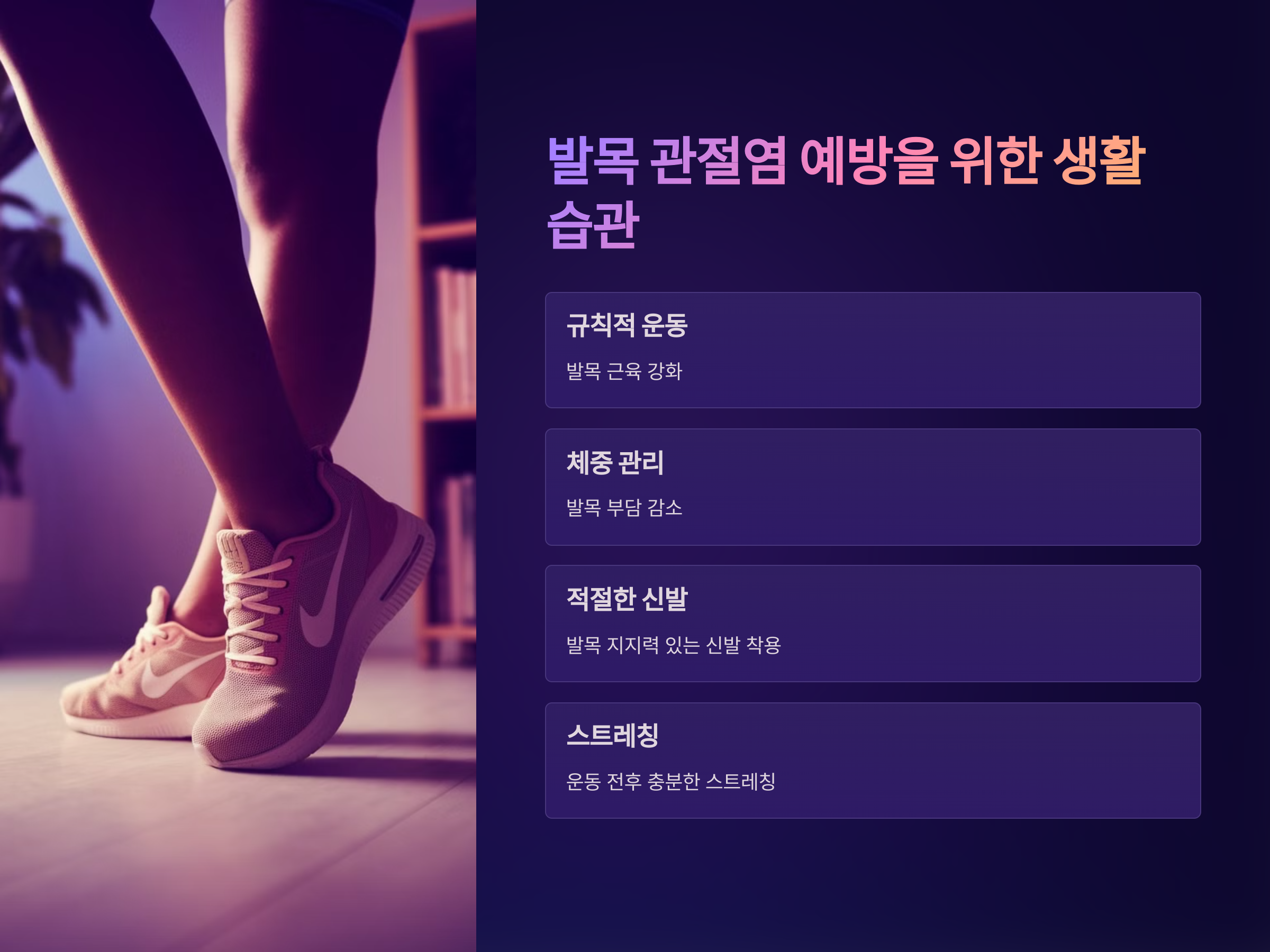 발목 관절염을 예방하려면 생활 습관을 개선하는 것이 매우 중요합니다. 일상적인 운동을 통해 발목의 근육을 강화하고, 비만을 예방하는 것이 발목 관절에 가해지는 부담을 줄이는 데 도움이 됩니다. 또한, 발목에 무리가 가는 활동을 피하고, 운동 전후에는 충분한 스트레칭을 하는 것이 좋습니다.