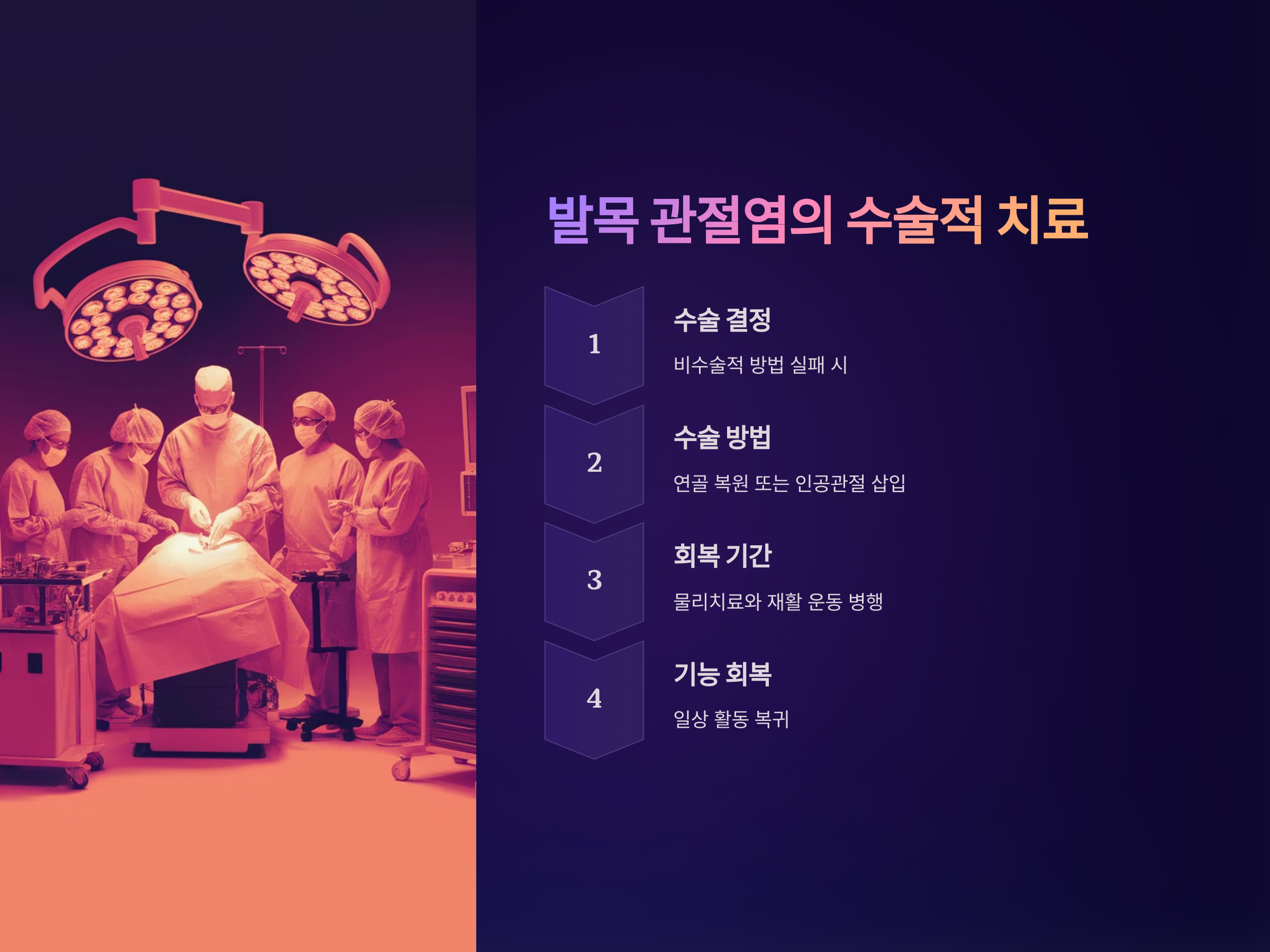 비수술적 방법으로 증상이 개선되지 않는 경우, 수술적인 방법을 고려할 수 있습니다. 발목 관절염이 심한 경우, 수술을 통해 연골을 복원하거나, 심한 경우에는 인공관절을 삽입하는 수술을 진행할 수 있습니다. 수술은 보통 치료 후 일정 기간 회복 시간이 필요하며, 회복 기간 동안에는 물리치료와 재활 운동을 병행하여 발목의 기능을 회복할 수 있습니다.