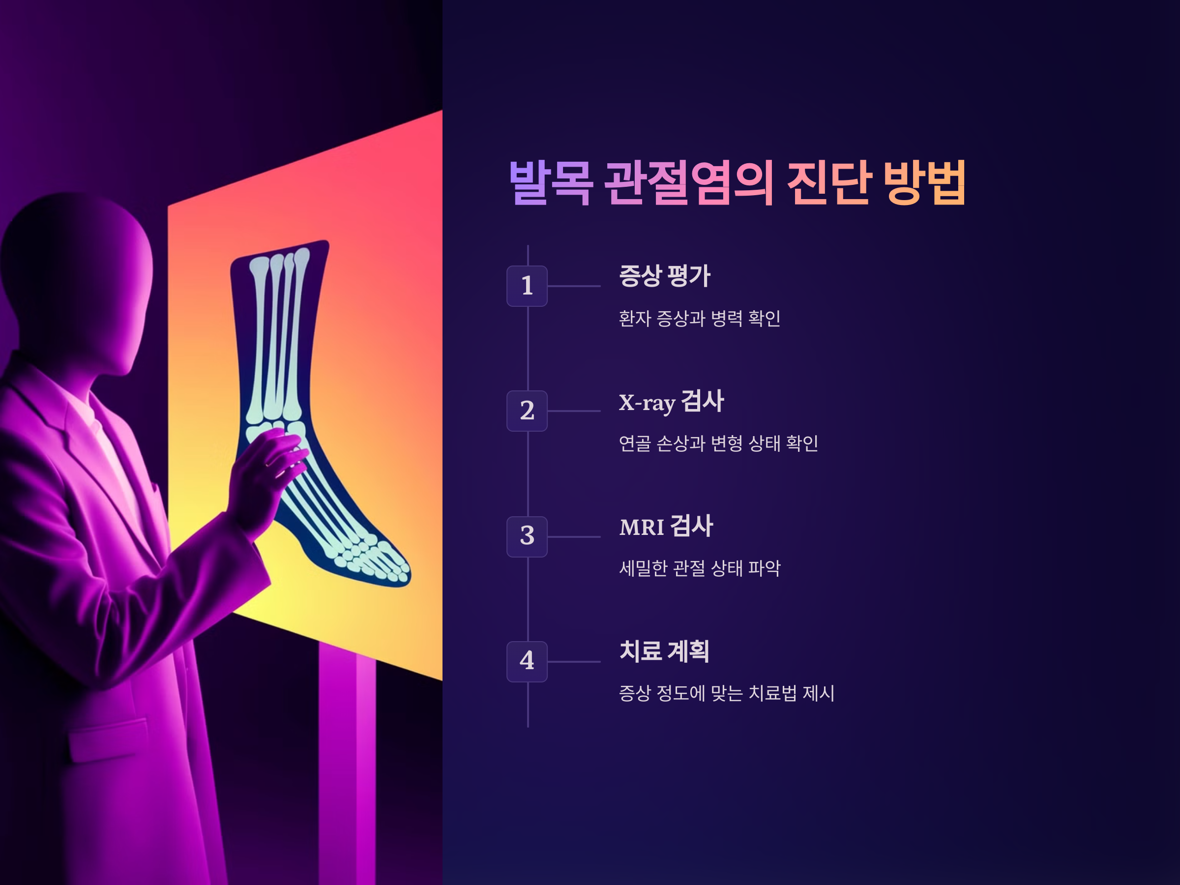 발목 관절염을 진단하기 위해서는 전문가의 진단이 필요합니다. 일반적으로 의사는 환자의 증상과 과거의 병력, 발목의 움직임 등을 평가하고, 필요시 X-ray나 MRI 등의 검사를 통해 발목의 연골 상태를 확인합니다. X-ray를 통해 연골의 손상 정도와 발목의 변형 상태를 확인할 수 있으며, MRI를 통해 더 세밀한 발목 관절의 상태를 파악할 수 있습니다.