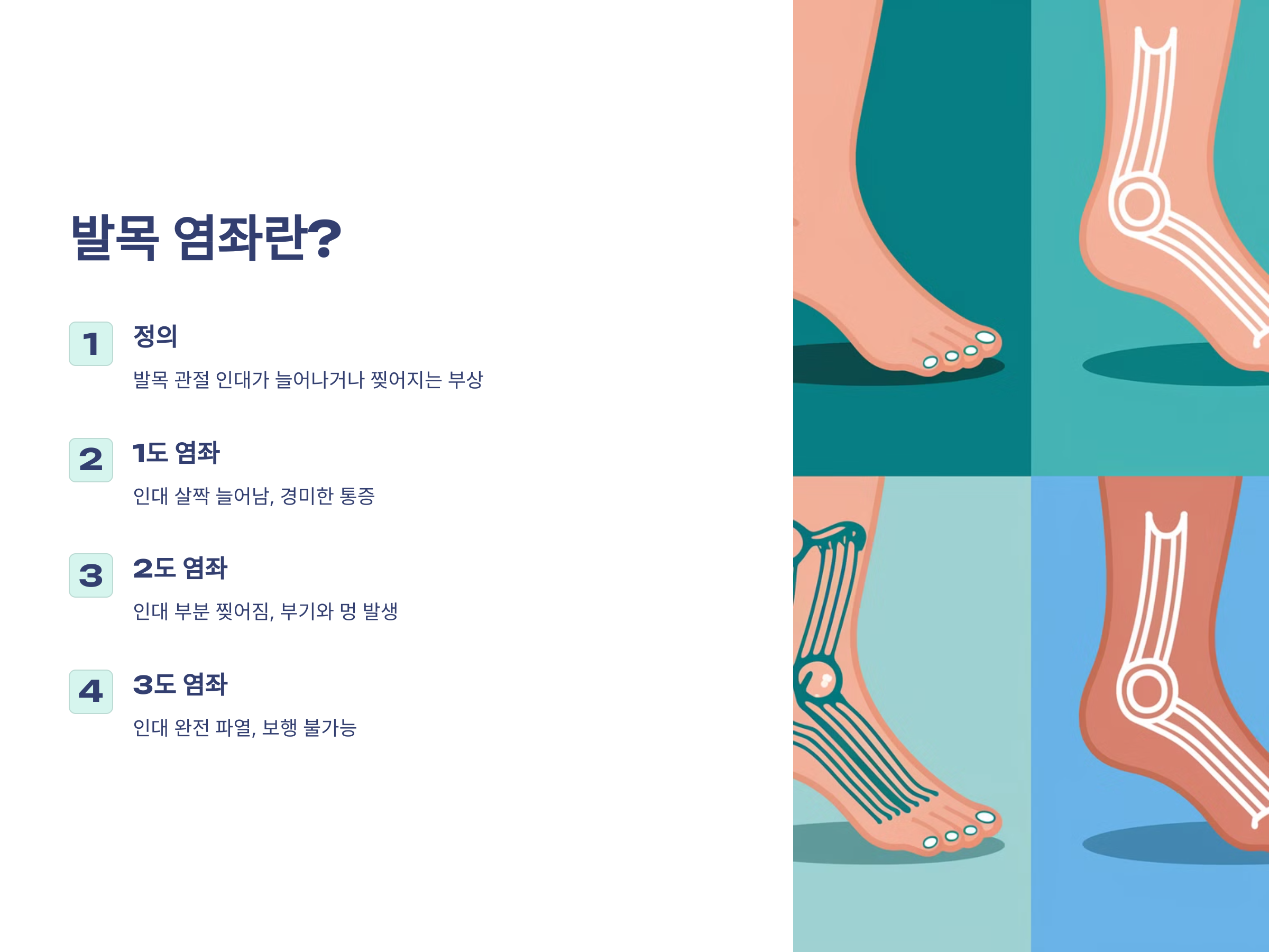 발목 염좌(Ankle Sprain)는 발목 관절을 지지하는 인대가 과도하게 늘어나거나 찢어지는 부상을 의미합니다. 주로 발목을 안쪽이나 바깥쪽으로 접질릴 때 발생하며, 인대 손상의 정도에 따라 경미한 염좌부터 심한 염좌까지 나뉩니다.