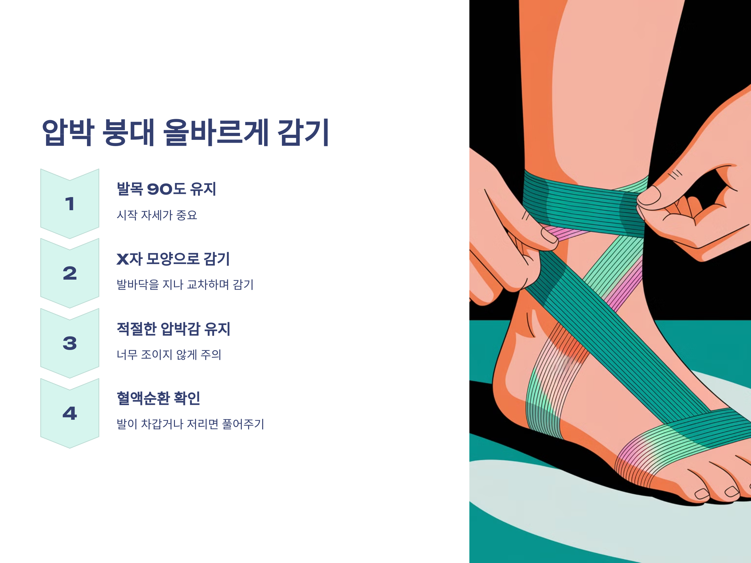 압박 붕대는 발목을 안정적으로 고정하여 추가적인 부상과 부종을 방지하는 역할을 합니다. 하지만 너무 세게 감으면 혈류를 방해할 수 있기 때문에 올바른 방법으로 감아야 합니다.