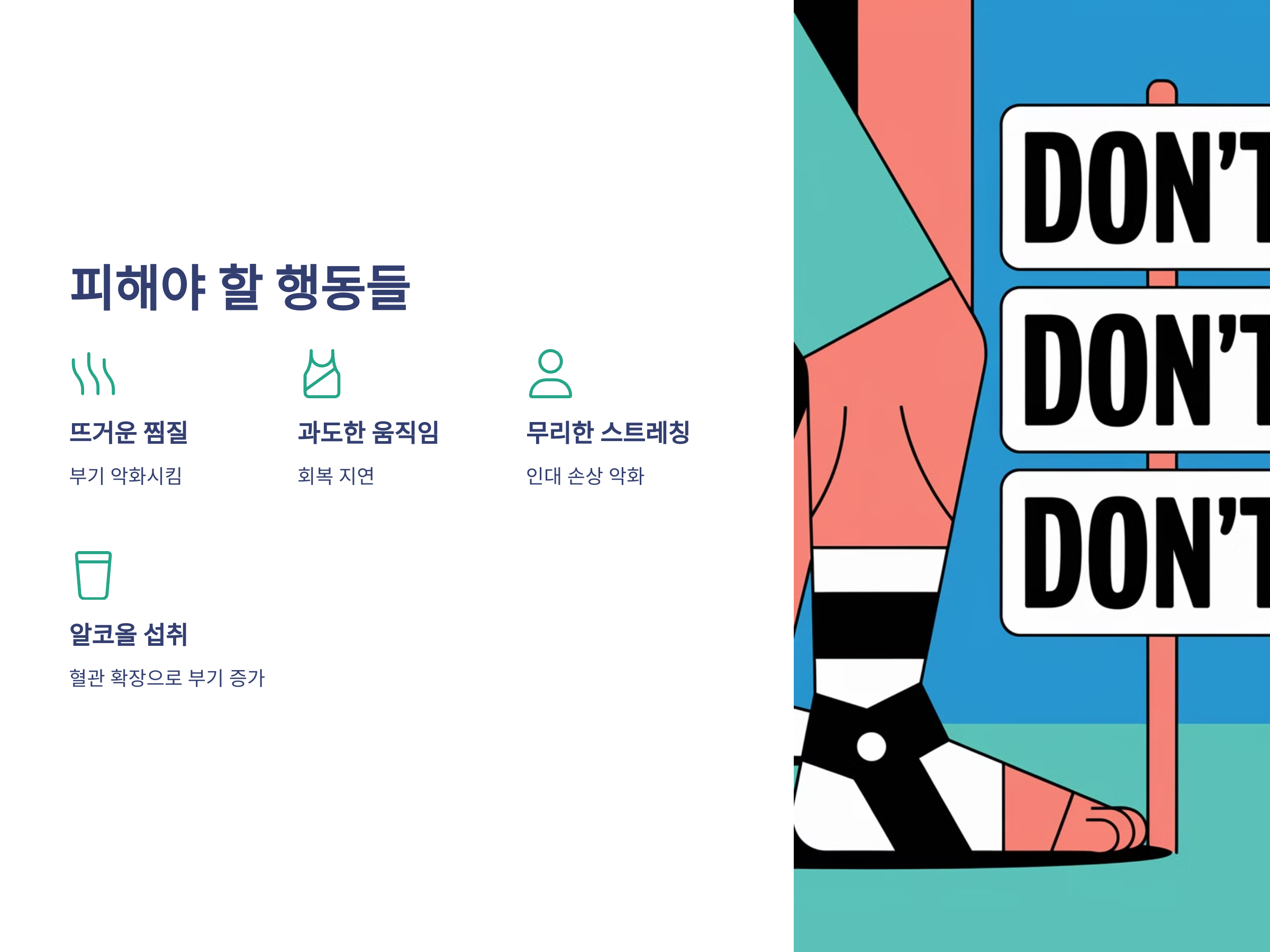 - 뜨거운 찜질: 부상 직후에는 냉찜질이 필요하며, 뜨거운 찜질은 부기를 악화시킬 수 있음.