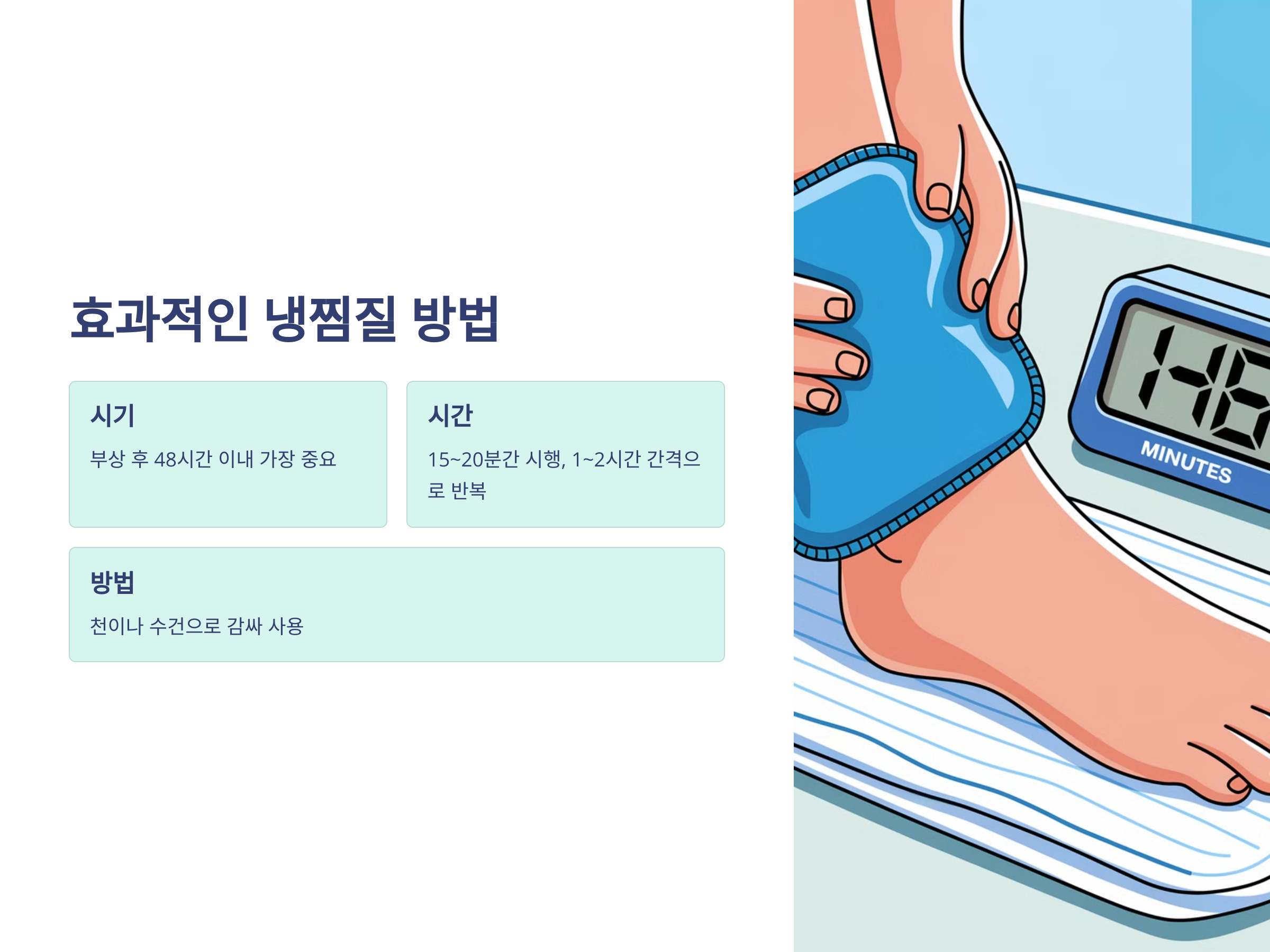 - 얼마나?: 한 번에 15~20분간 냉찜질을 하고, 1~2시간 간격으로 반복합니다.