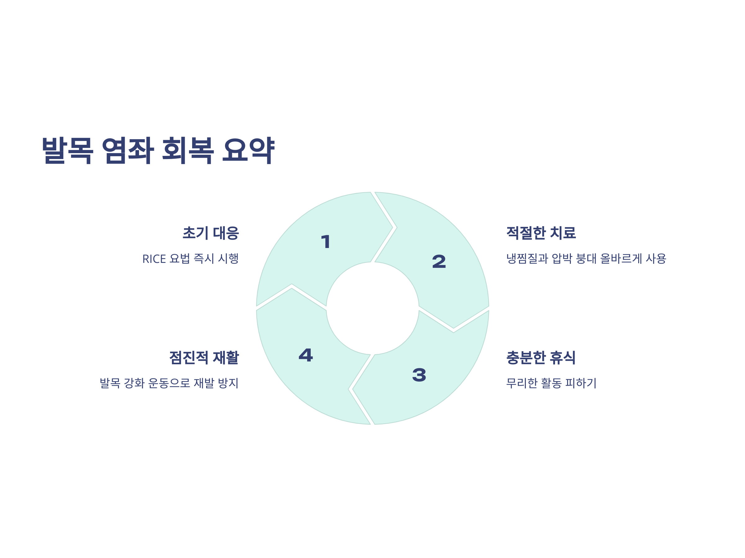 이 네 가지 요소를 적절하게 적용하면 발목 염좌의 회복 기간을 단축할 수 있습니다.