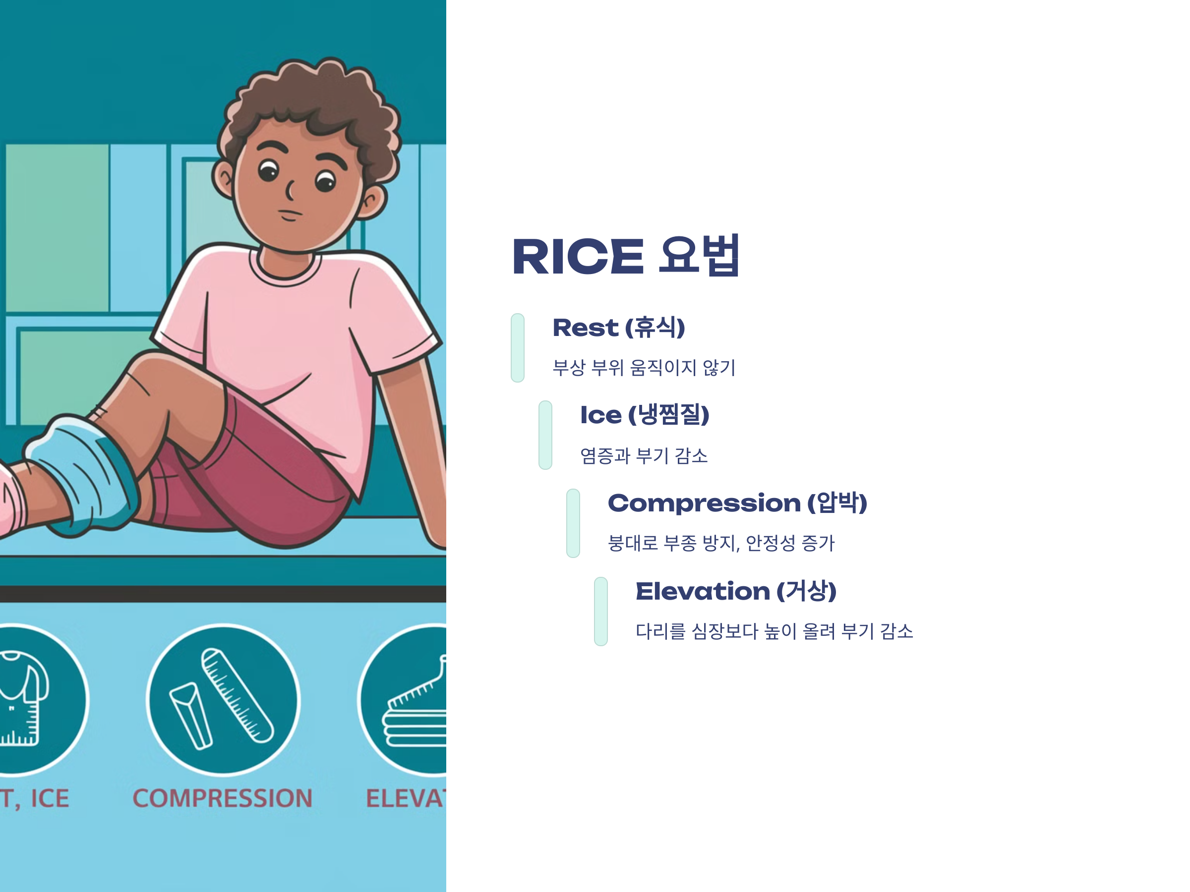 - Rest(휴식): 부상 부위를 움직이지 않도록 쉬게 합니다.