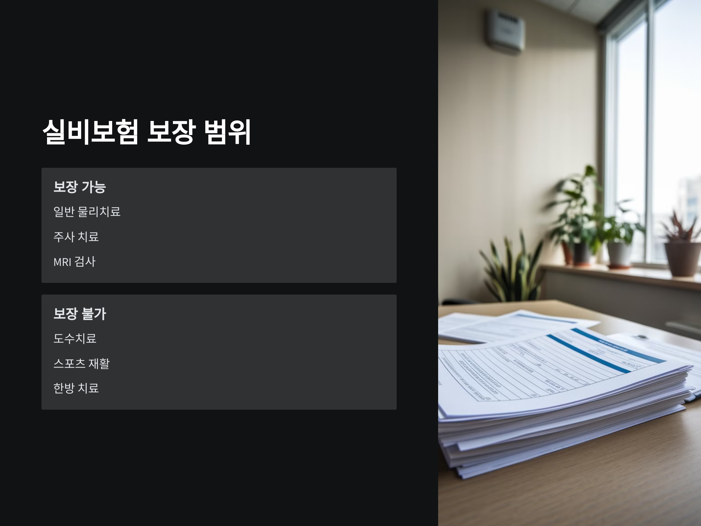 - 도수치료: 일부 보험에서는 특약 가입 시 보장되나 기본 실비보험에서는 제외되는 경우 많음