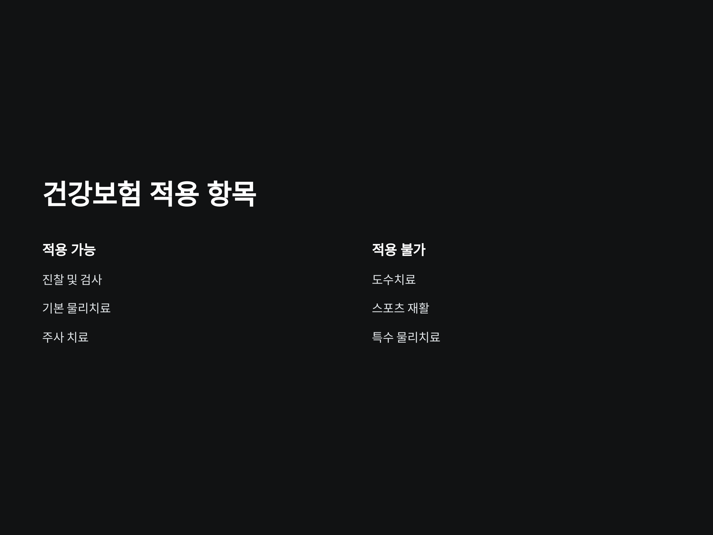 특히 도수치료나 스포츠 재활 치료를 받을 계획이라면 건강보험이 적용되지 않음을 미리 알고 본인 부담금을 확인하는 것이 좋습니다.