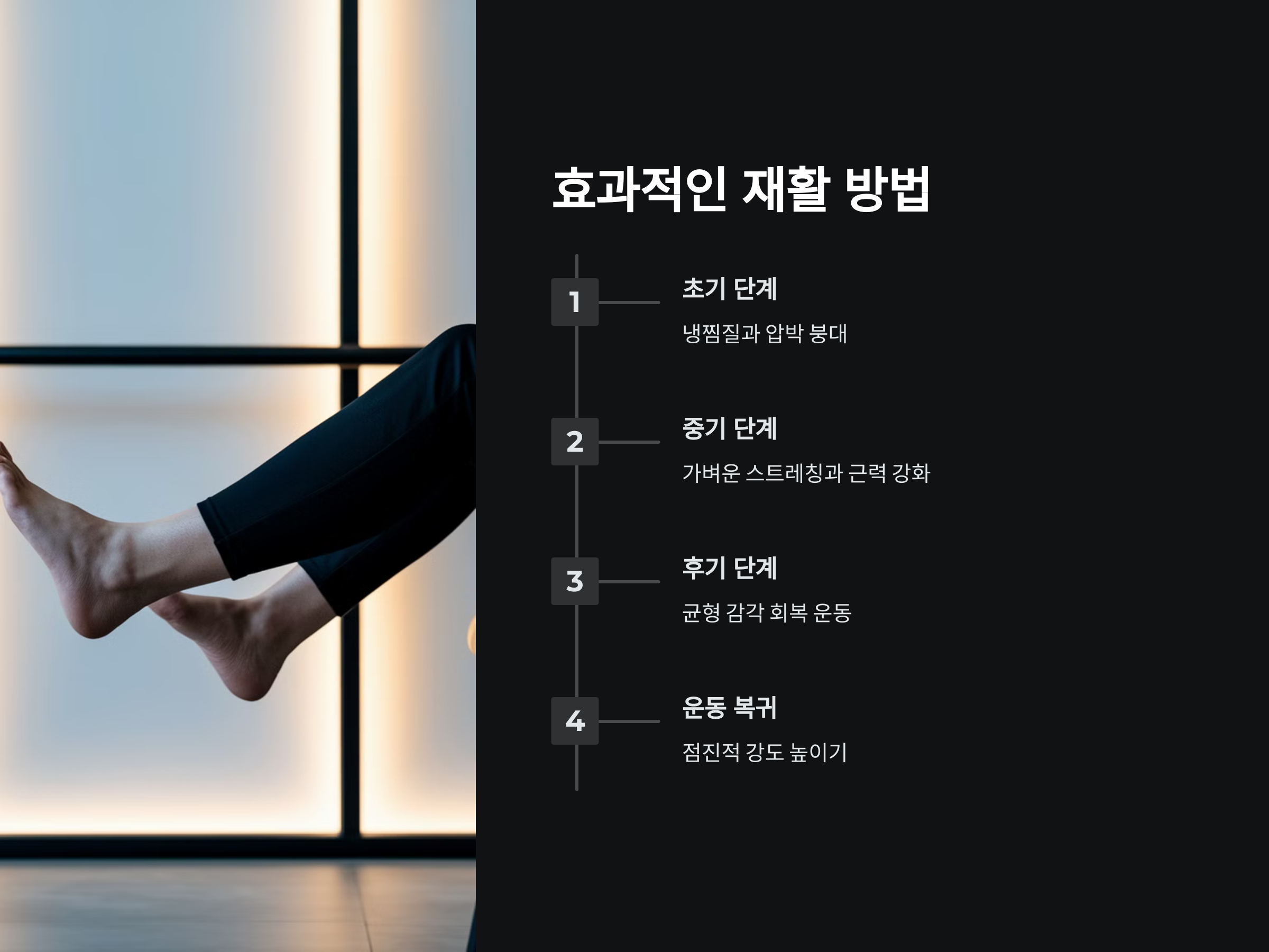 - 중기 단계: 가벼운 스트레칭과 발목 근력 강화 운동 시작