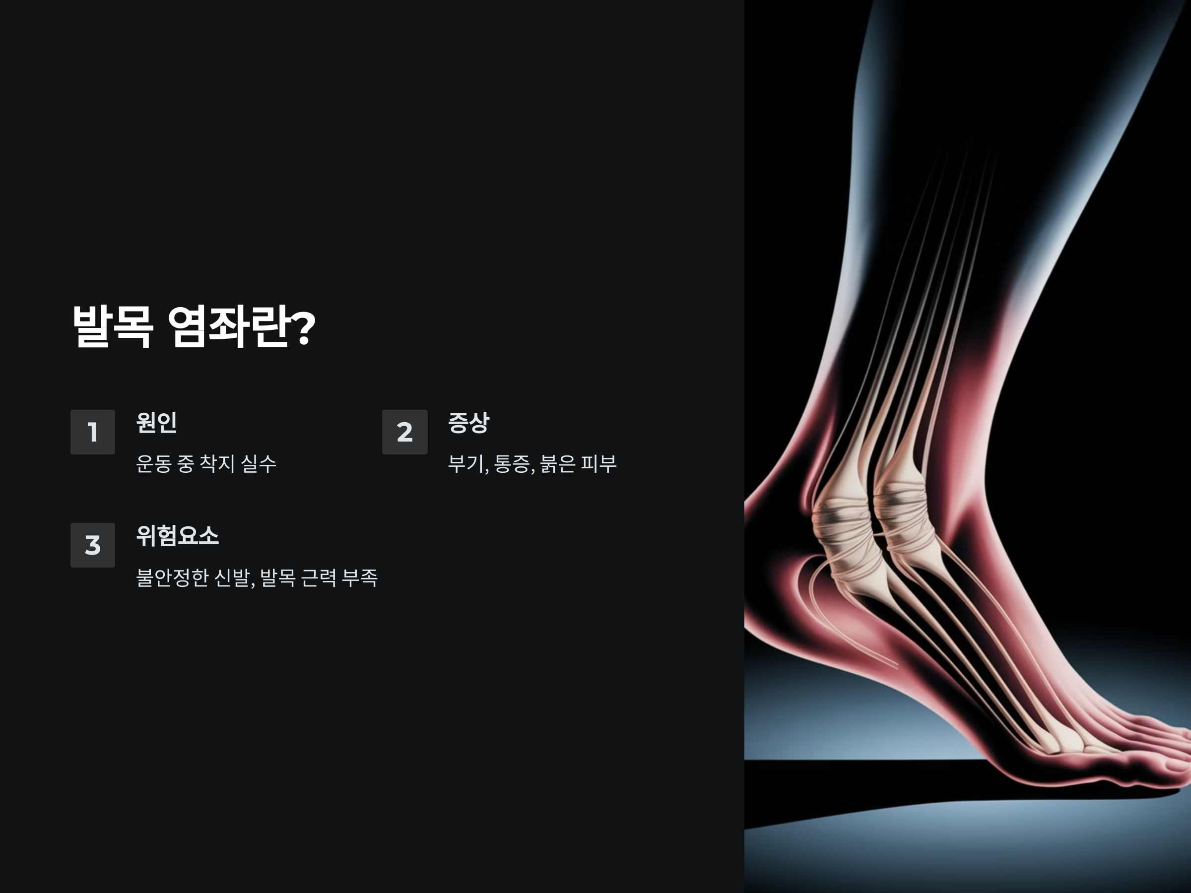 발목 염좌는 발목을 삐끗하면서 인대가 손상되는 부상을 말합니다. 일반적으로 발목을 안쪽이나 바깥쪽으로 과도하게 꺾이는 경우 발생하며, 경미한 경우부터 심한 경우까지 손상 정도에 따라 단계가 나뉩니다.