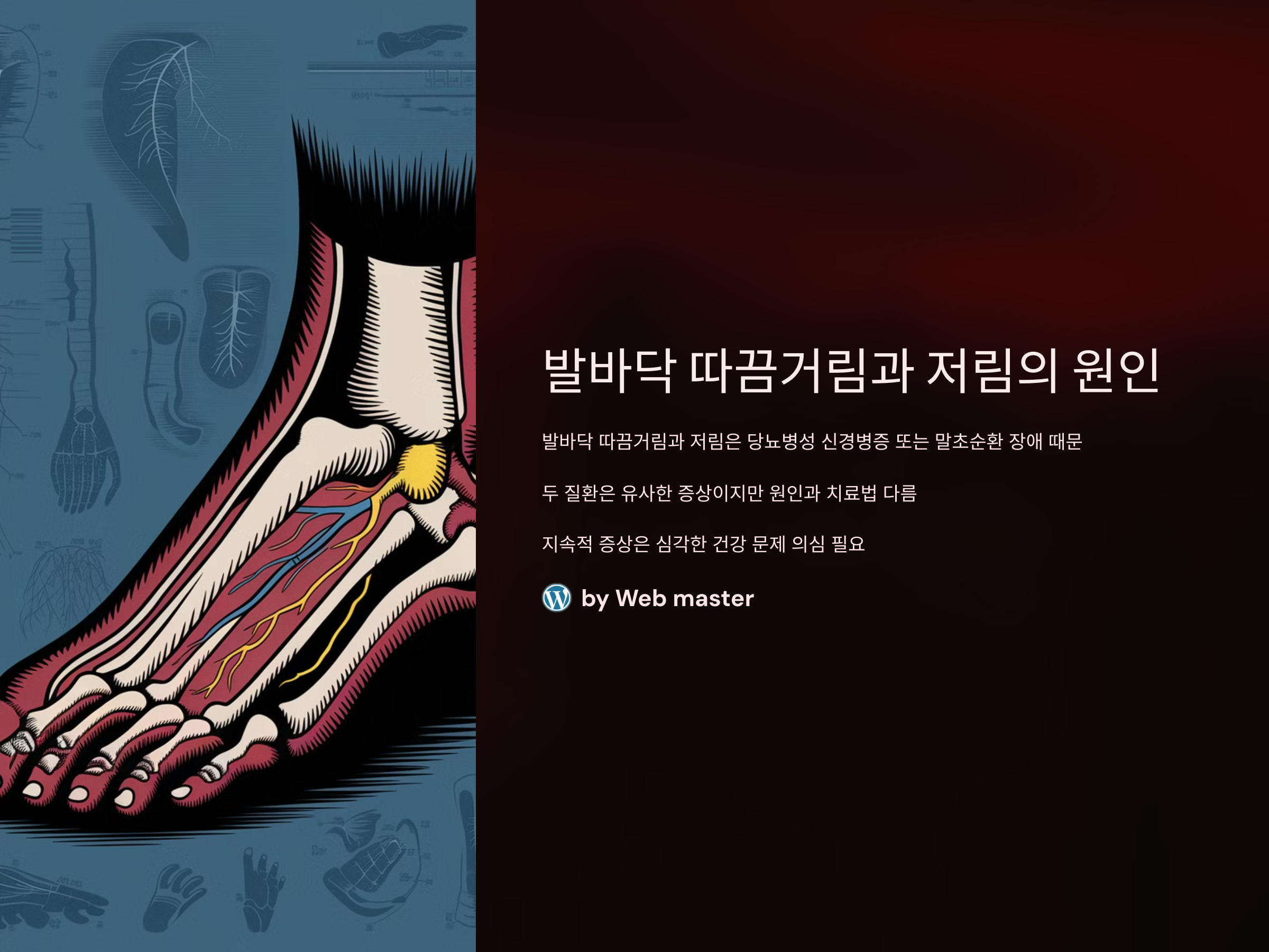 발바닥에 따끔거림과 저린 느낌을 경험하는 사람들은 그 원인을 찾기 위해 다양한 가능성을 고려해야 합니다. 이러한 증상은 일상생활에서 불편함을 유발하고, 종종 당뇨병성 신경병증 또는 말초순환 장애와 같은 질환과 관련이 있습니다. 두 질환 모두 발바닥에 저리거나 따끔거리는 느낌을 유발할 수 있지만, 그 원인과 치료 방법에는 큰 차이가 있습니다. 이 글에서는 당뇨병성 신경병증과 말초순환 장애의 차이점을 알아보고, 각각의 증상과 치료법을 자세히 살펴보겠습니다.