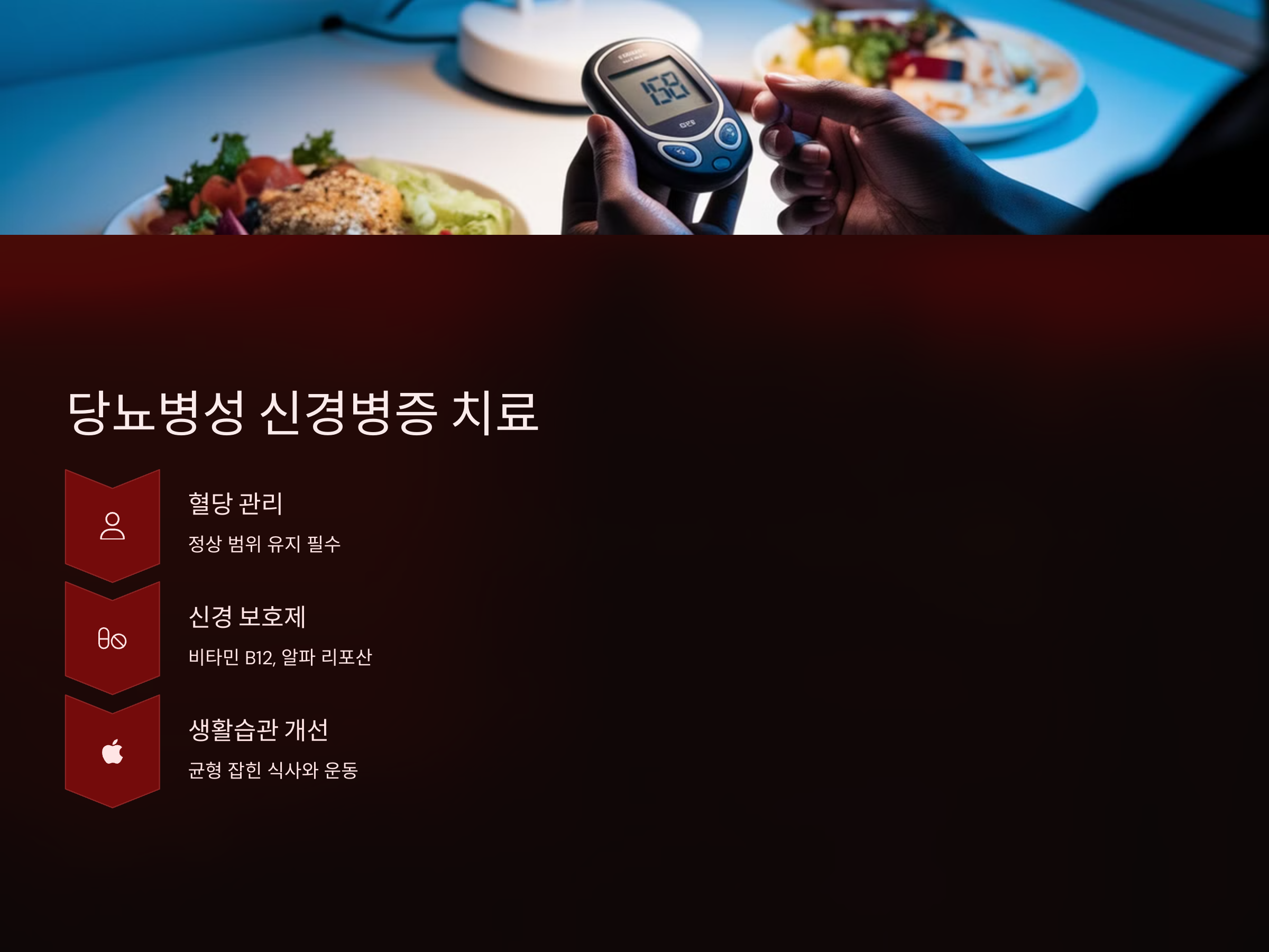- 치료에는 혈당 조절과 신경 보호가 필요