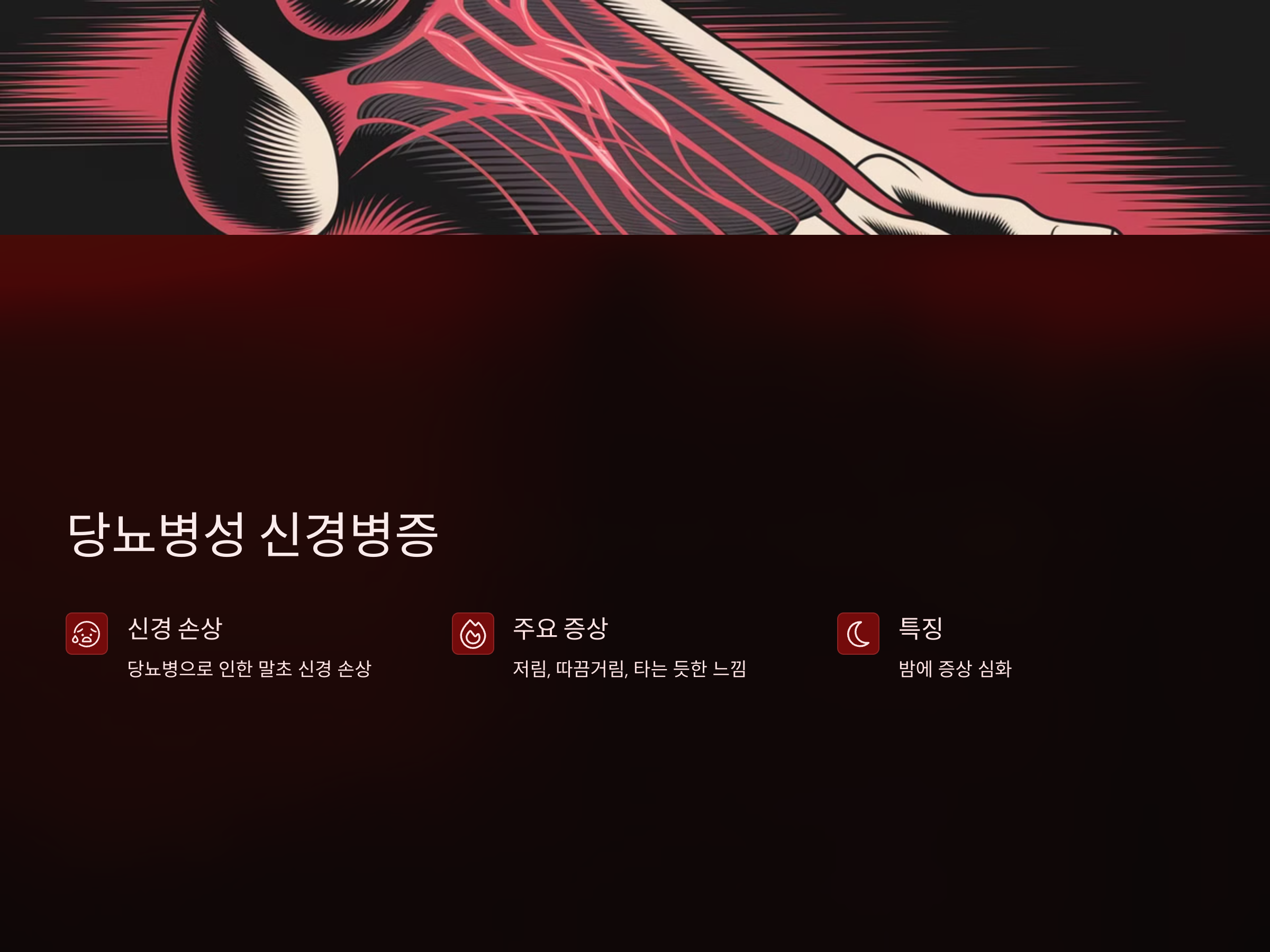 당뇨병성 신경병증은 당뇨병이 진행됨에 따라 발생하는 신경 손상으로, 특히 말초 신경에 영향을 미칩니다. 이 질환은 당뇨병을 오래 앓아온 환자에게서 흔히 발생하며, 발바닥이나 발끝을 포함한 하체에 저림, 따끔거림, 혹은 타는 듯한 느낌을 유발할 수 있습니다. 이 증상은 밤에 더욱 심해지는 경향이 있으며, 시간이 지나면서 점점 더 심각한 통증으로 발전할 수 있습니다.