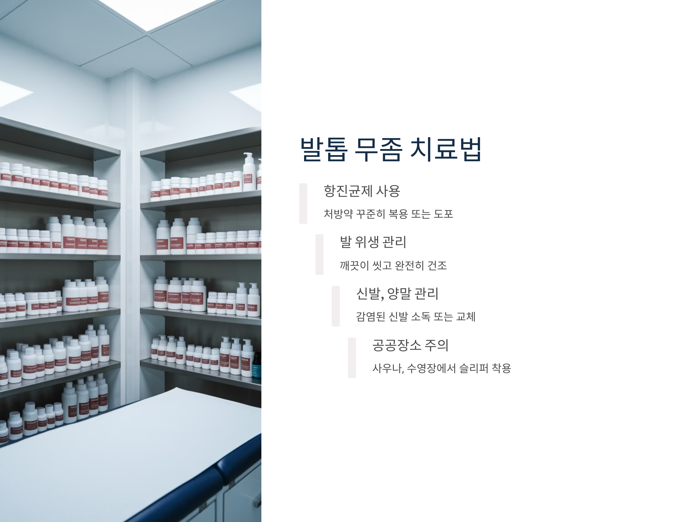 발톱 무좀은 곰팡이 감염이므로 항진균제 치료가 필요하며, 조기에 치료하지 않으면 발톱이 심하게 손상될 수 있습니다.