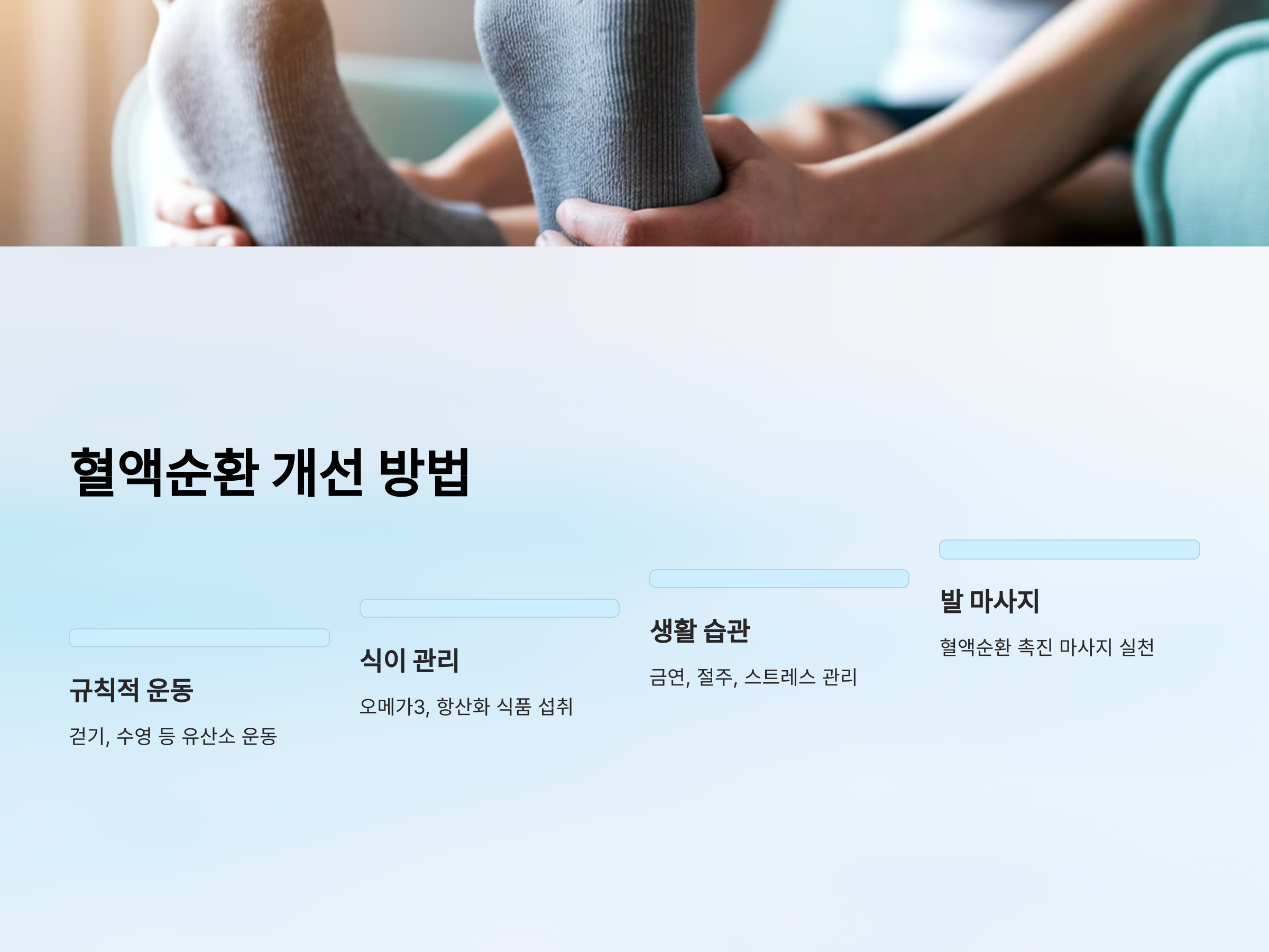 이런 경우에는 발뿐만 아니라 종아리나 무릎 주변도 차가운 경우가 많고, 계단을 오를 때 통증이 심해지거나 발바닥이 화끈거리는 증상을 동반하기도 합니다. 이는 단순 무좀과는 확연히 다른 양상을 보이므로 자가 진단 시 참고해야 합니다. 혈액순환 장애는 방치할 경우 괴사나 절단의 위험도 있으므로 빠른 진단과 관리가 필수입니다.