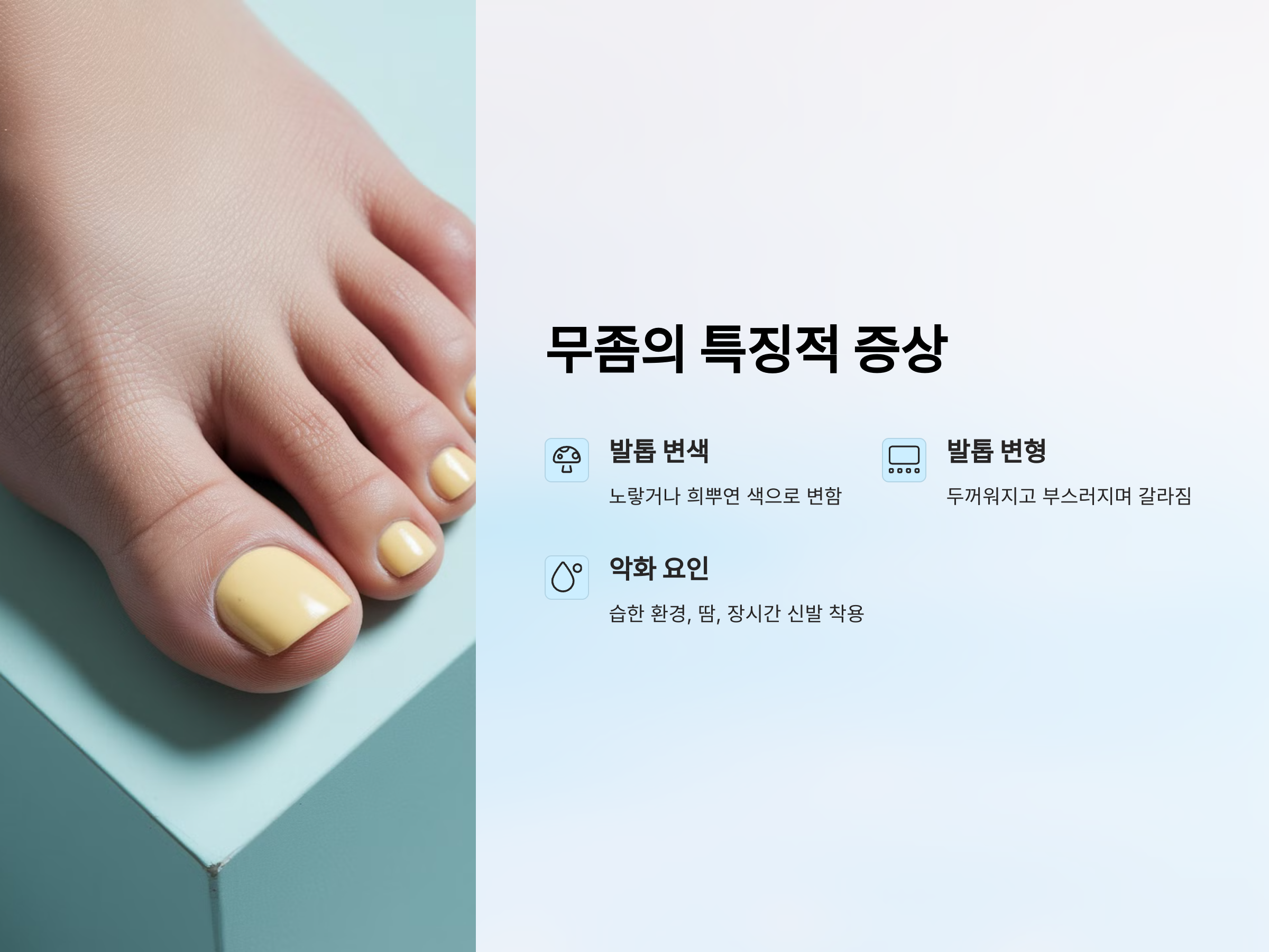 무좀은 피부사상균이라는 곰팡이균에 의해 발생하며, 손톱보다는 발톱에 더 자주 생기는 질환입니다. 특히 발톱무좀은 조갑백선이라고도 하며, 초기에는 별다른 통증 없이 발톱이 누렇게 변하거나 희뿌연 색을 띠며 두꺼워집니다. 점차 시간이 지나면서 발톱 끝이 부스러지고 갈라지며, 심할 경우 발톱 전체가 떨어지는 경우도 있습니다.